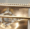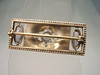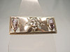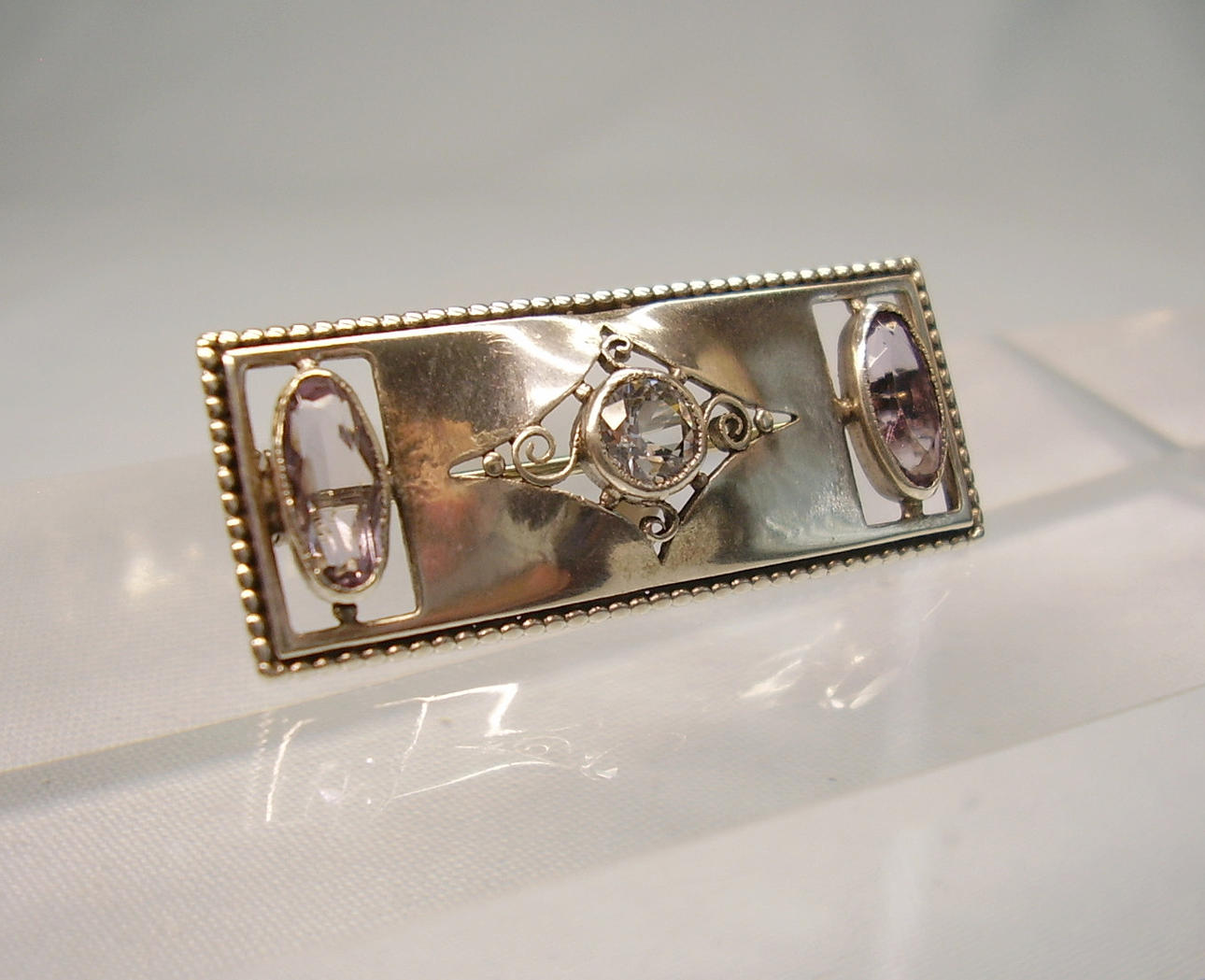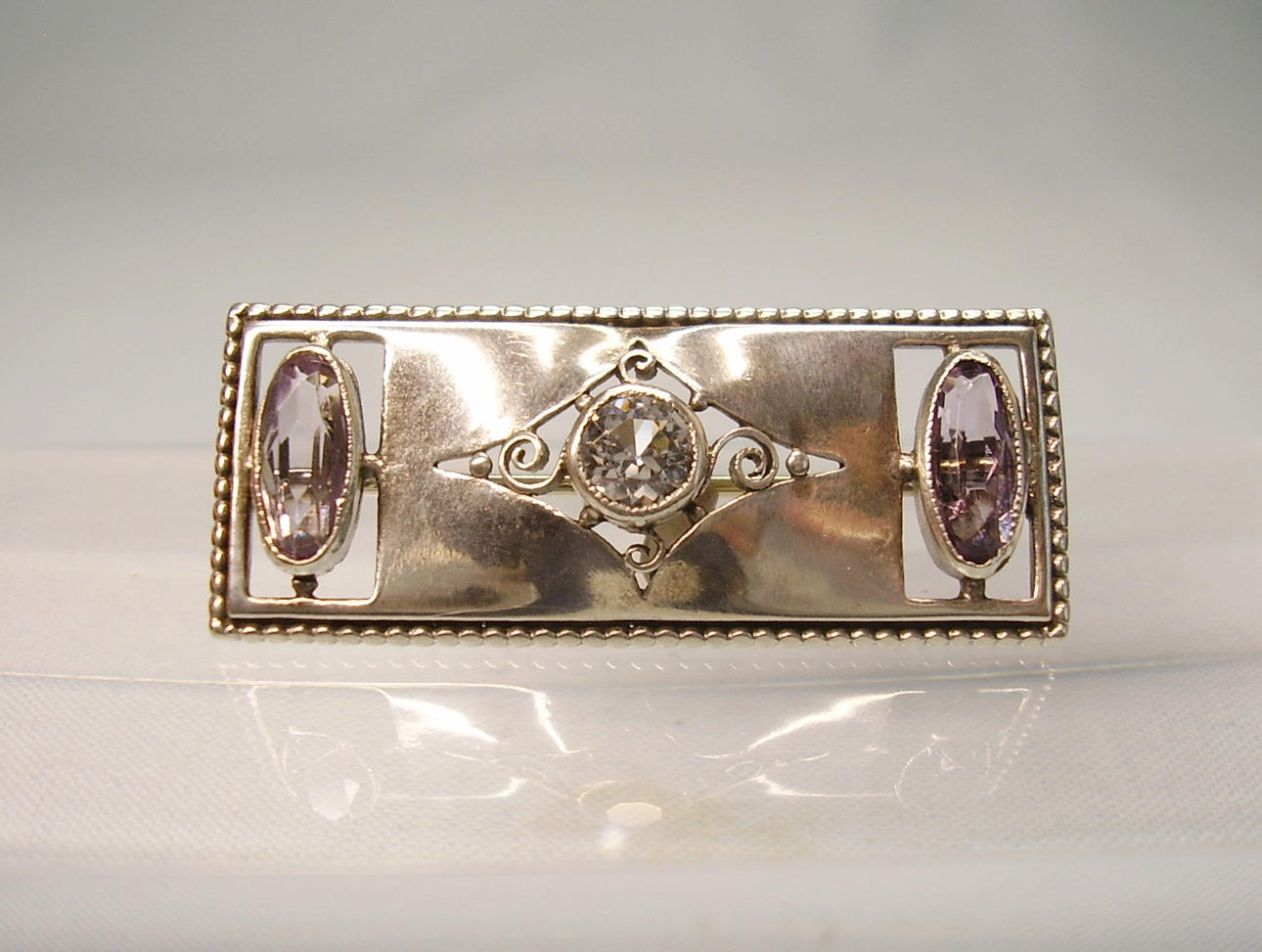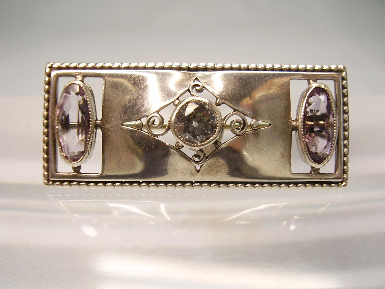 Die polierte Silberfläche hat an beiden Enden eine rechteckige Aussparung, die einen langovalen facettierten fliederfarbenen Spinell trägt, die Mitte ist rautenförmig verziert und trägt einen rund facettierten weißen Spinell.
