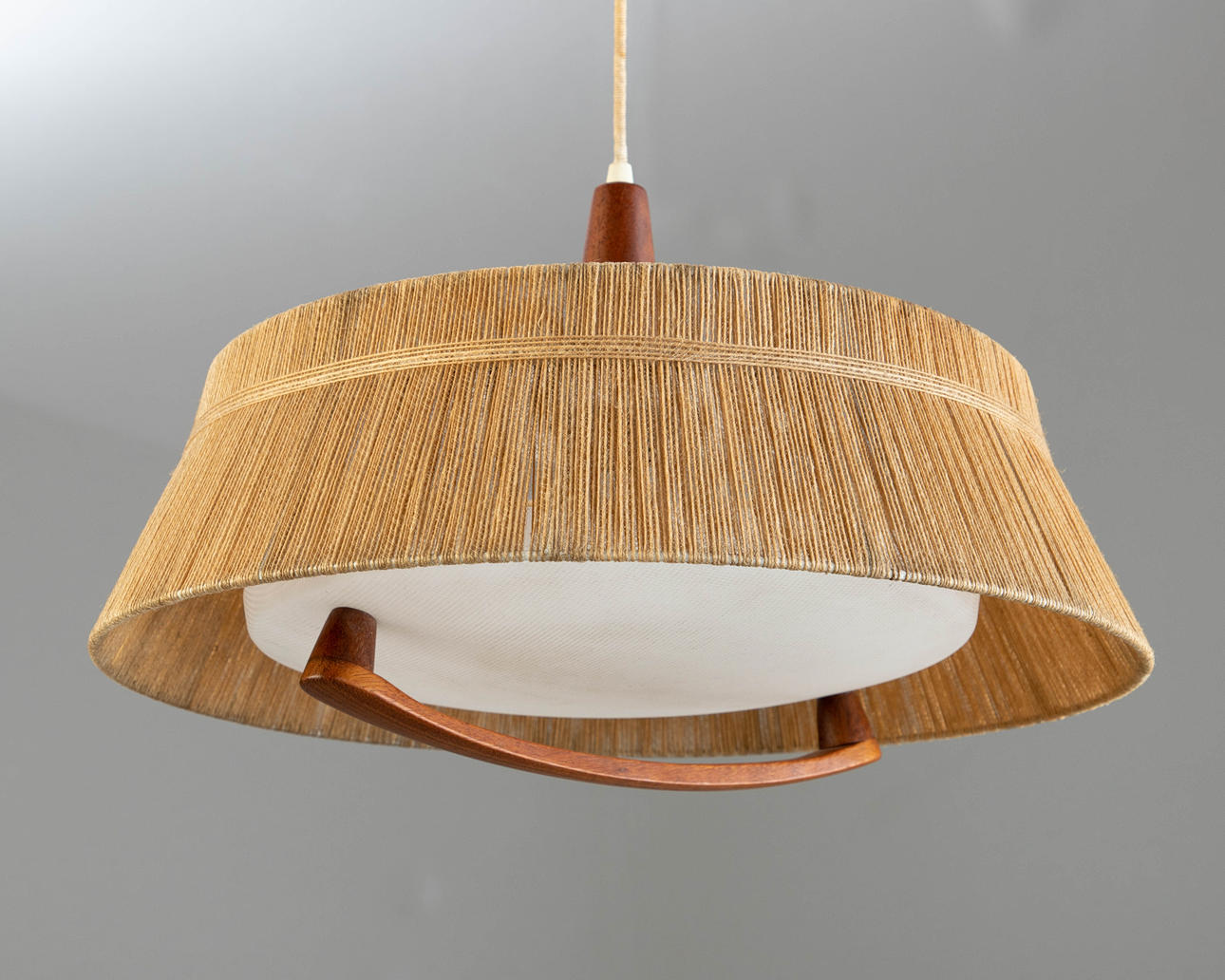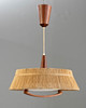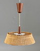 1960er Jahre. Höhenverstellbar. Lampenschirm aus Sisal mit Elementen aus Teakholz, Blende aus Kunststoff. Ø 50 cm.