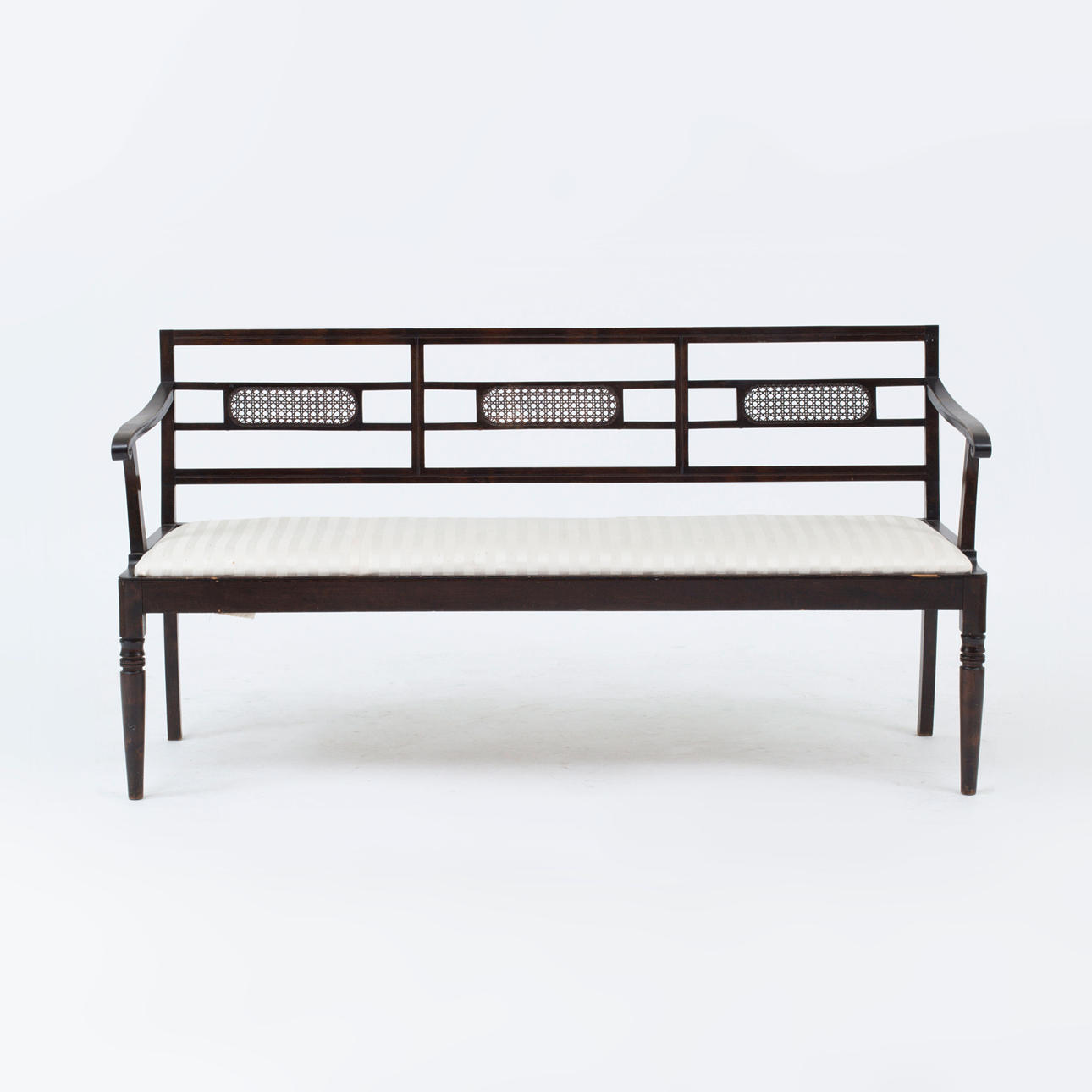 Gestell aus geflochtener Birke mit Rattandekor auf der Rückseite. Lose gepolsterter und gepolsterter Sitz. Länge 161 cm, Sitzhöhe 45 cm, Rückenhöhe 81 cm.