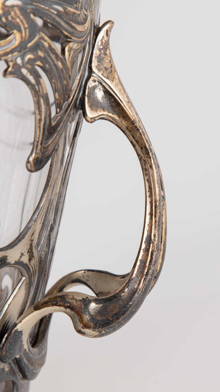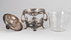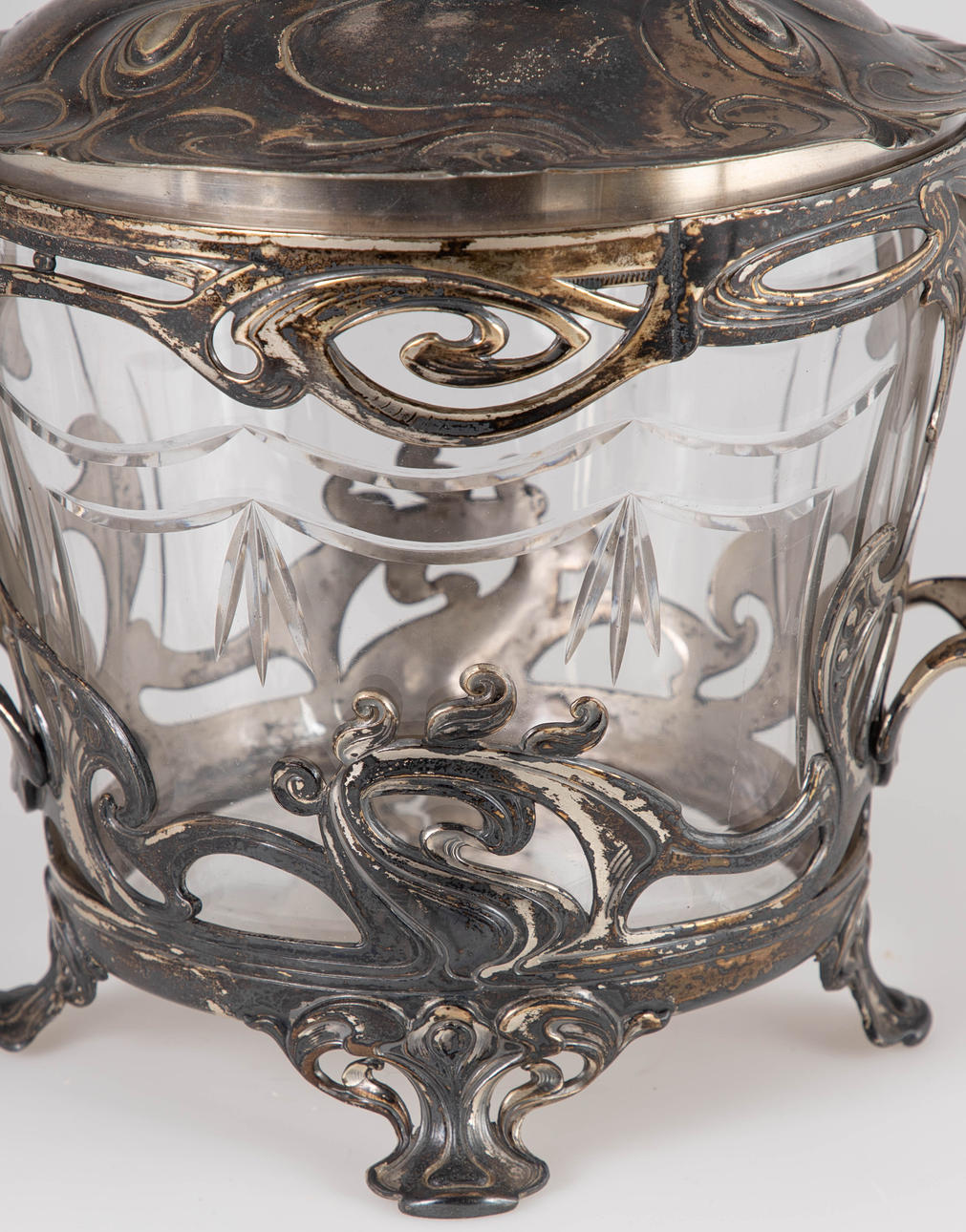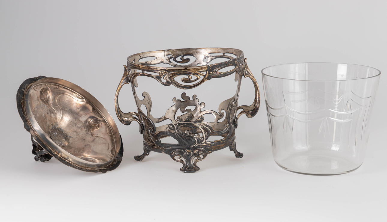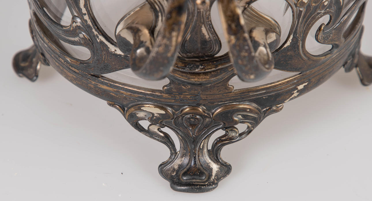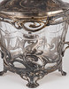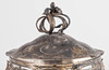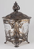 Zinn versilbert, Kristallglas. Dreiteiliger Korpus. Offen durchbrochener Floraldekor auf entsprechenden Füßen. Plastischer Lilienknauf auf dem gewölbten Deckel. HxB: 37,5 x 32 cm. Herstellerstempelmarke.