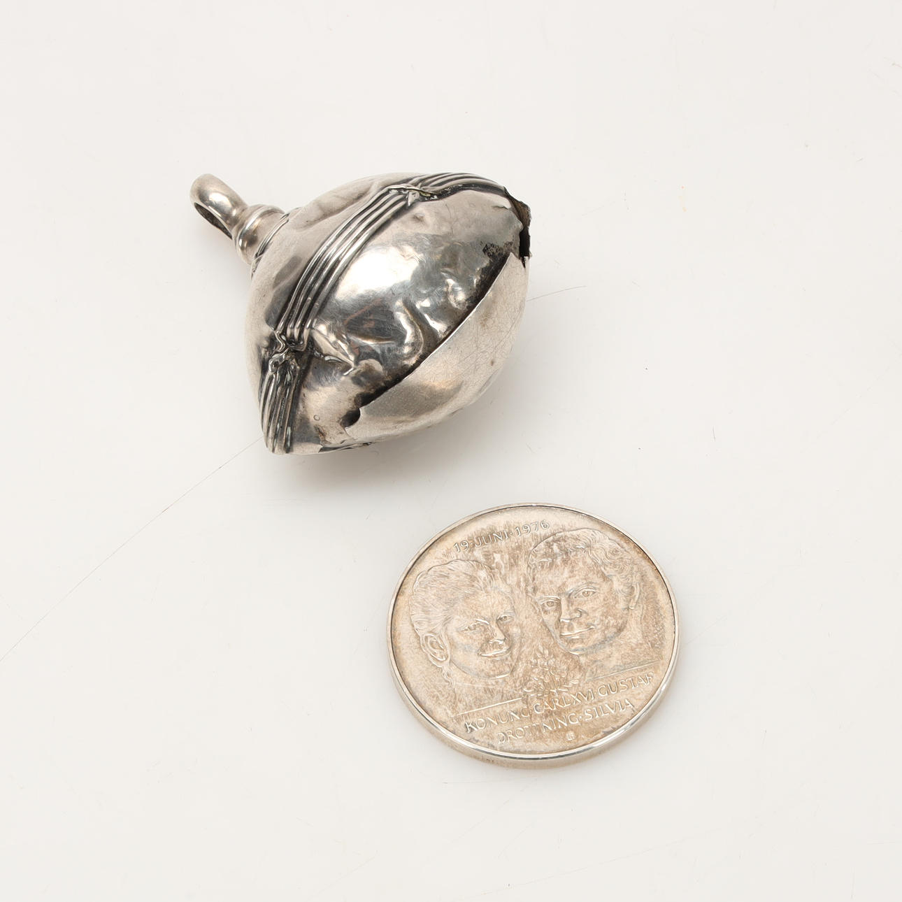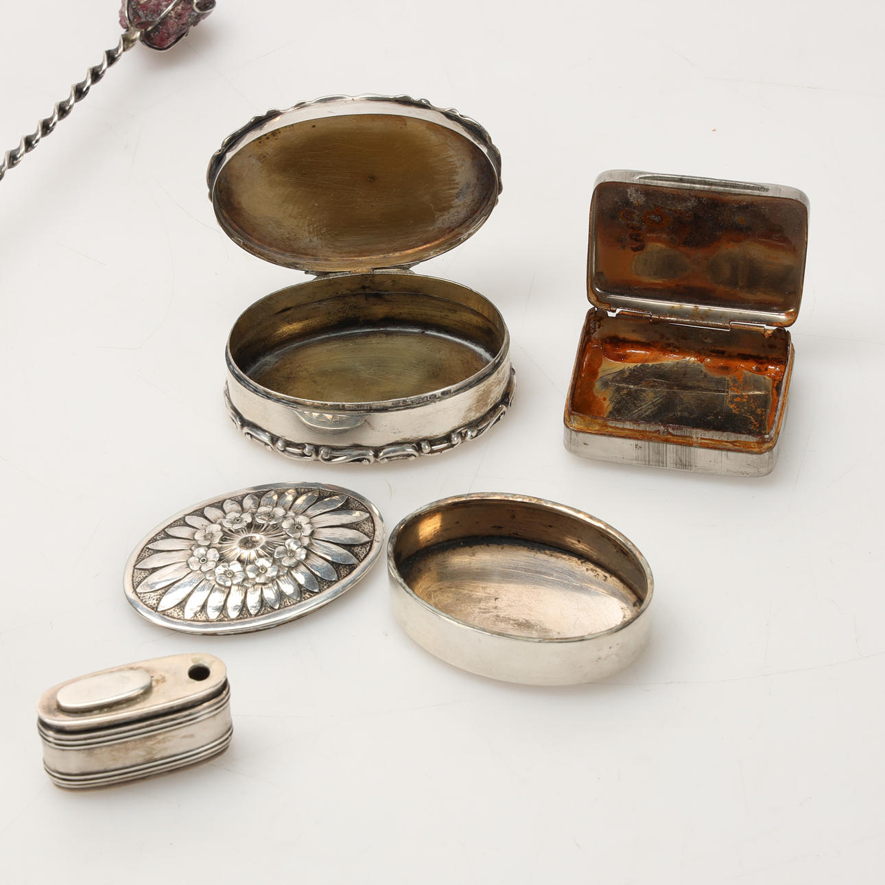KÄSTCHEN, MÜNZEN, GLOCKE, LÖFFEL, 7 Teile, Silber.