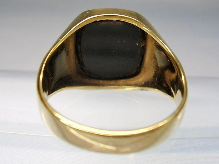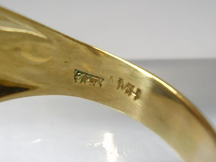 Der Herrenring ist in Gelbgold 333 = 8 Karat gearbeitet und punziert, dazu trägt es das Goldschmiede-Meisterzeichen M.H.