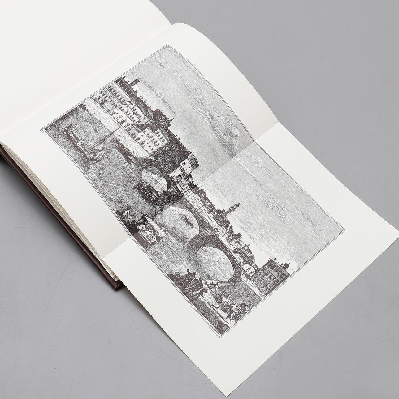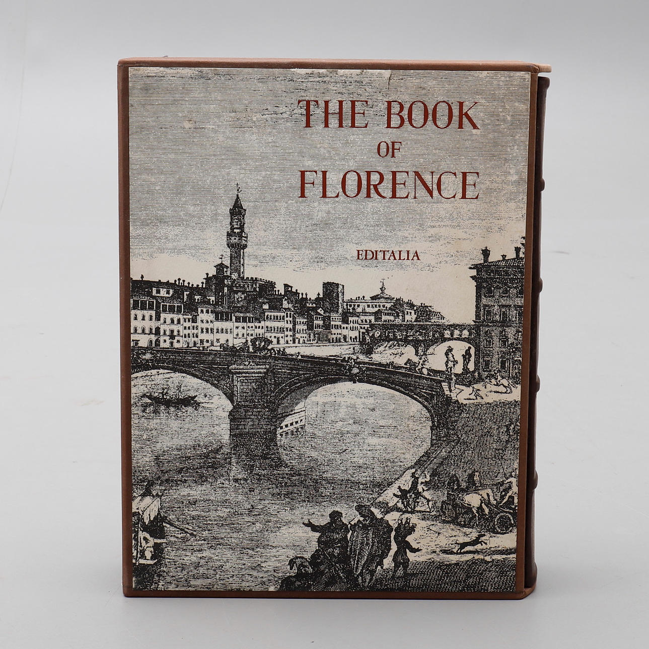 Bee, Harry - Acton, Harold, Editalia 1973, Rom. Folio auf Büttenpapier in Ledereinband gedruckt, Vorderdeckel mit Kupferplatte verziert mit Florentiner Lilie im Relief, Kassette mit Illustration des florentinischen Stadtbildes vom südlichen Brückenpfeiler der Ponte Santa Trinita aus gesehen. Limitierte Auflage von 1949 Exemplaren, ex nummeriert 638, reich illustriert mit reproduzierten Stichen, inklusive ausklappbarem Stadtplan von Florenz, 242 Seiten.