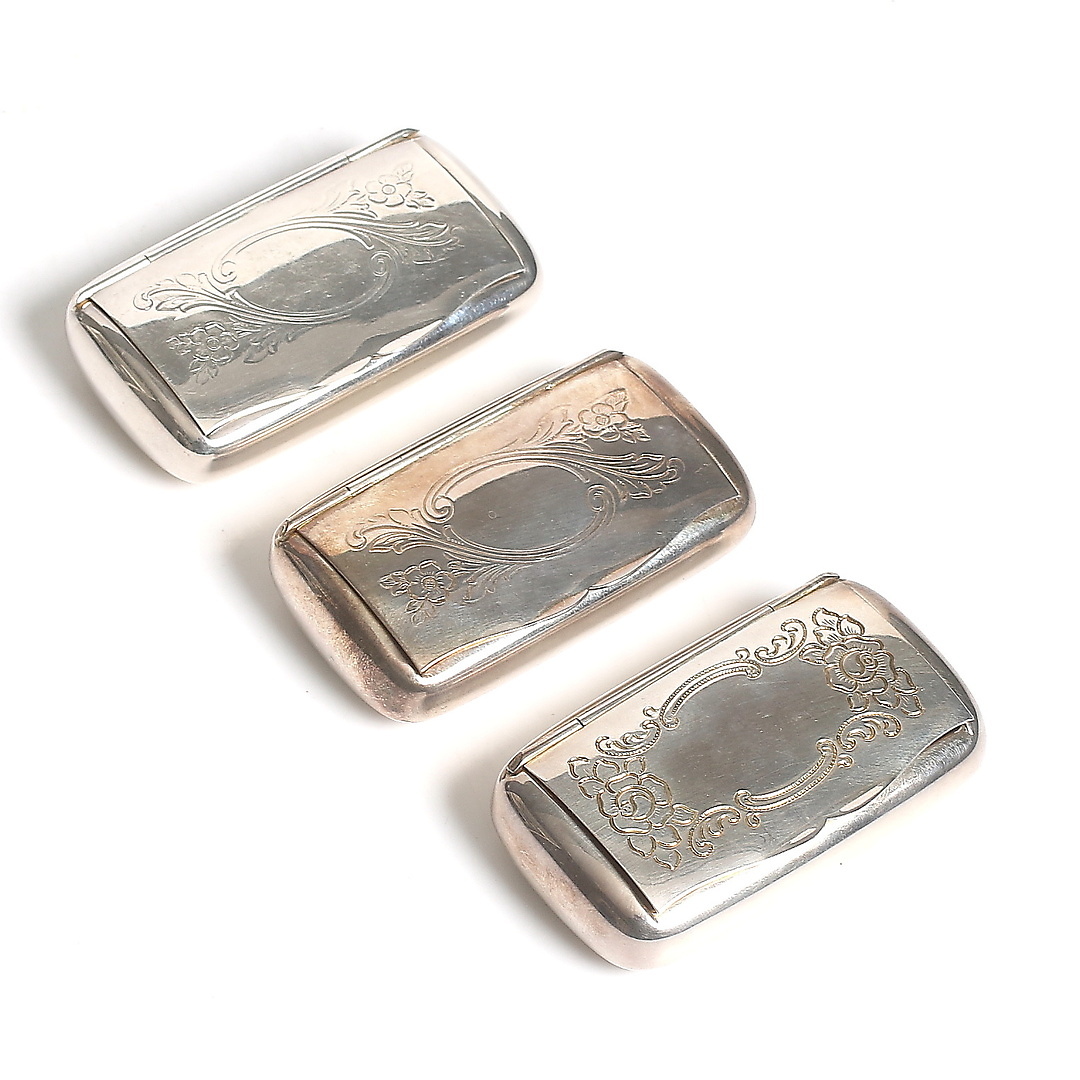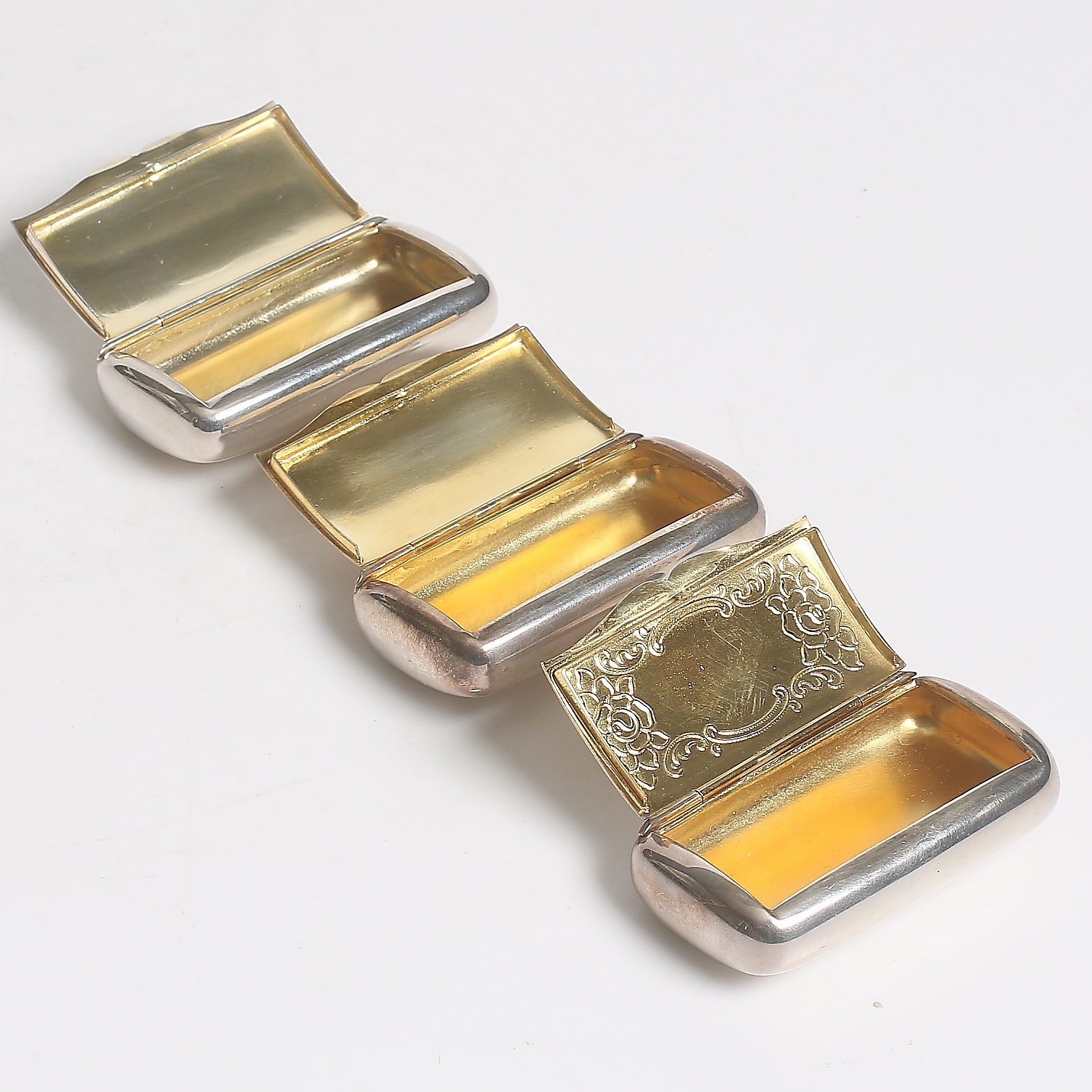 192372. SNUS-BOXEN, 3 Stück, Silber, Importmarken. 1900er.