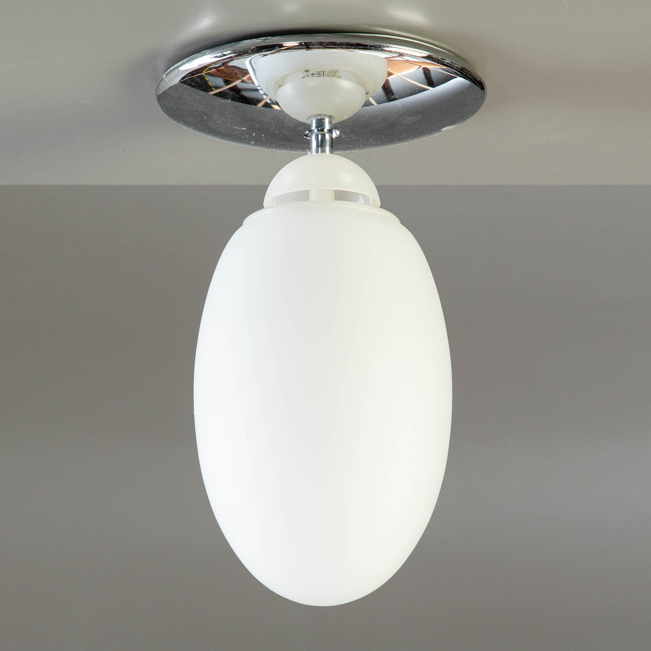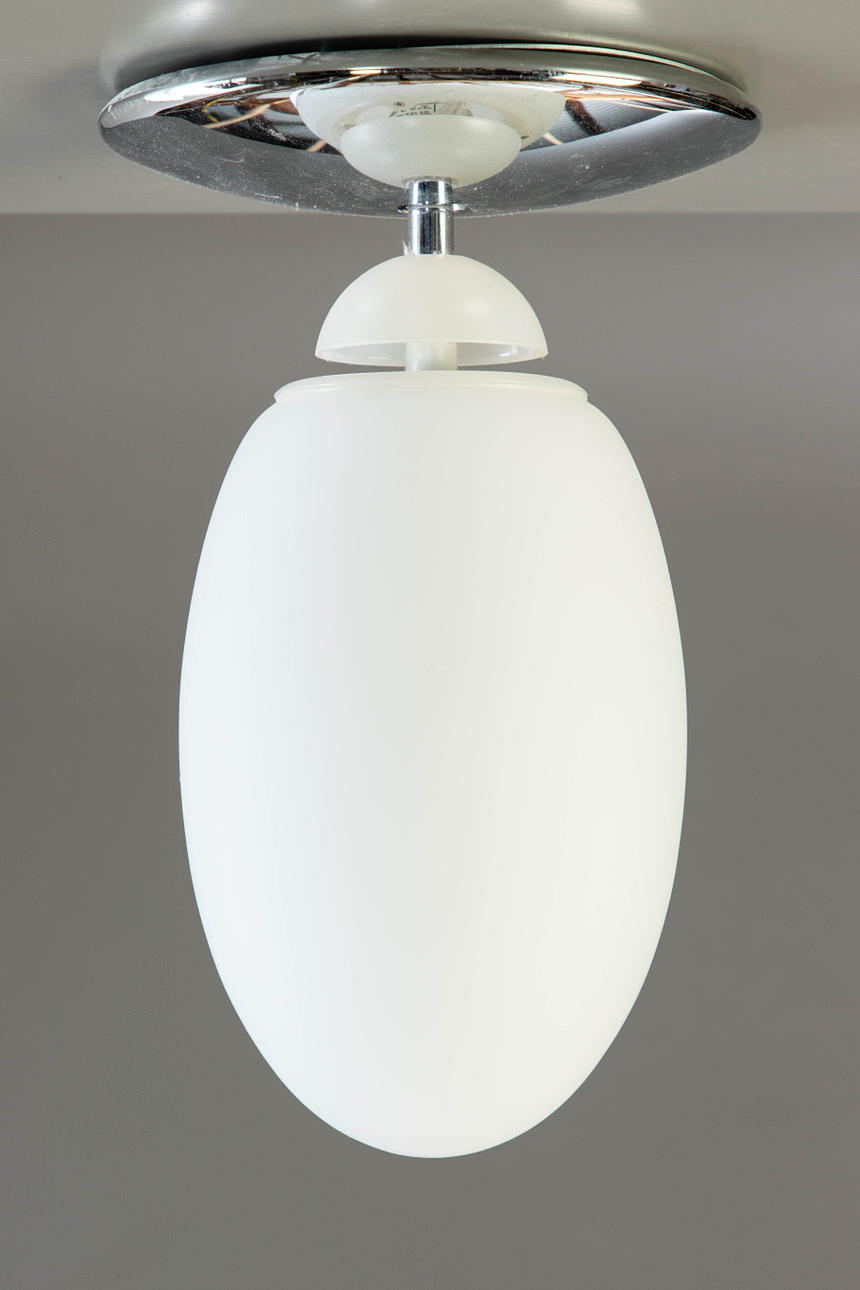 Entwurf: 1992. Deckenaufhängung aus verchromtem Metall, Diffusor aus mattweißem Opalglas. H.32 cm, Ø 20 cm.