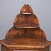 Eckschrank aus dunkel gebeizter Kiefer, mit zwei Regalen, sowie ein Schrank mit einem Regal im Inneren.