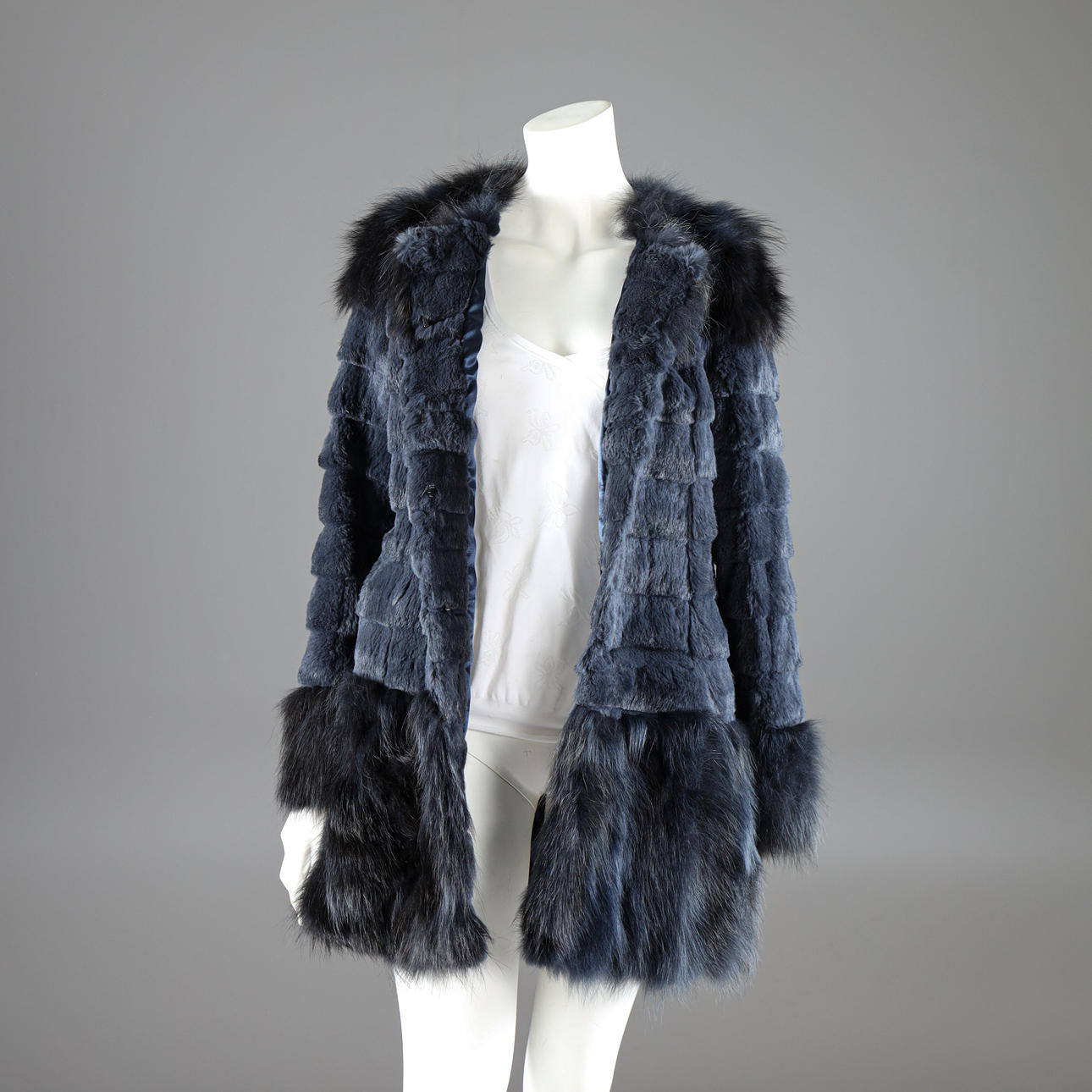 Mitternachtsblauer Zobel und Kaninchen. Geknöpfte Seitentaschen vorne. Zwei Einschubtaschen. Rückenlänge ca. 75 cm, Brustweite ca. 88 cm, Ärmellänge ca. 62 cm.