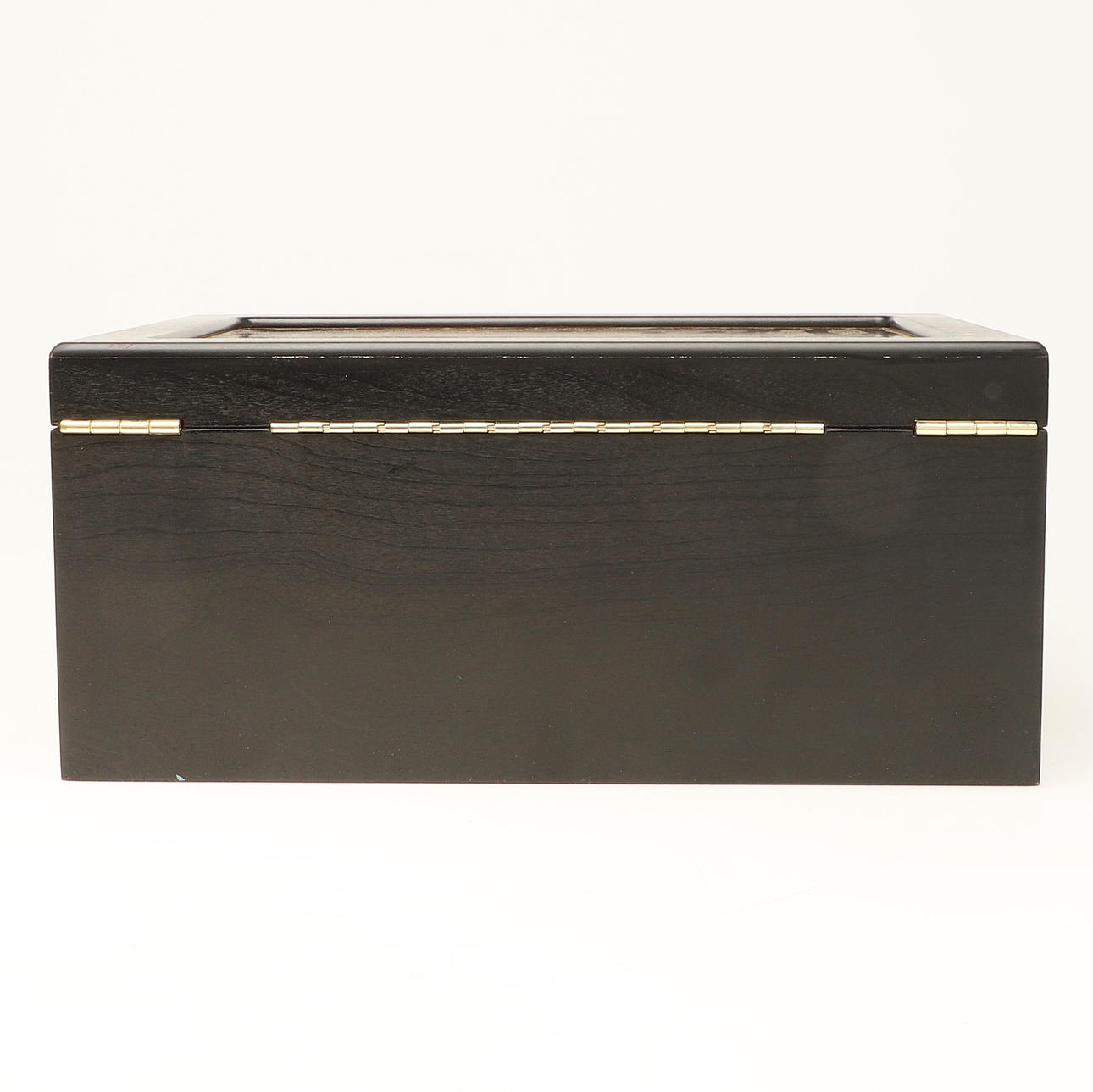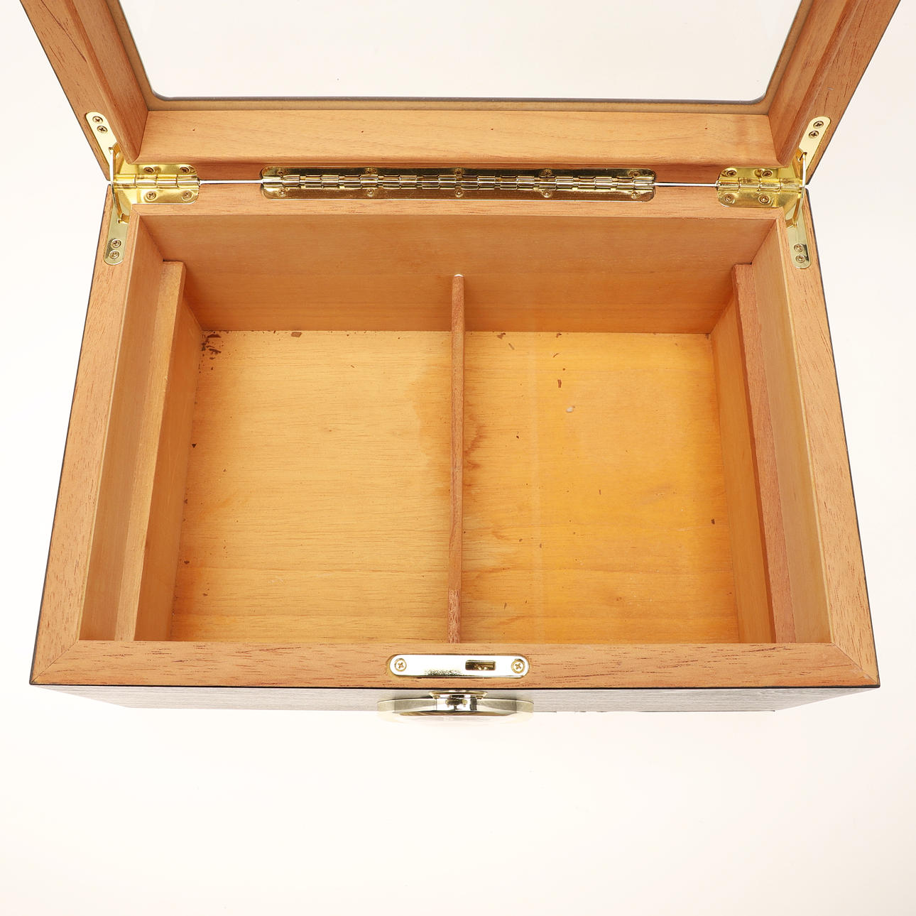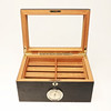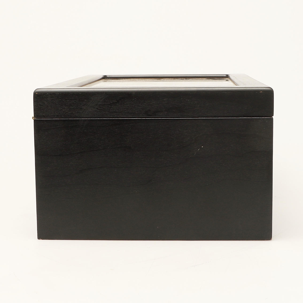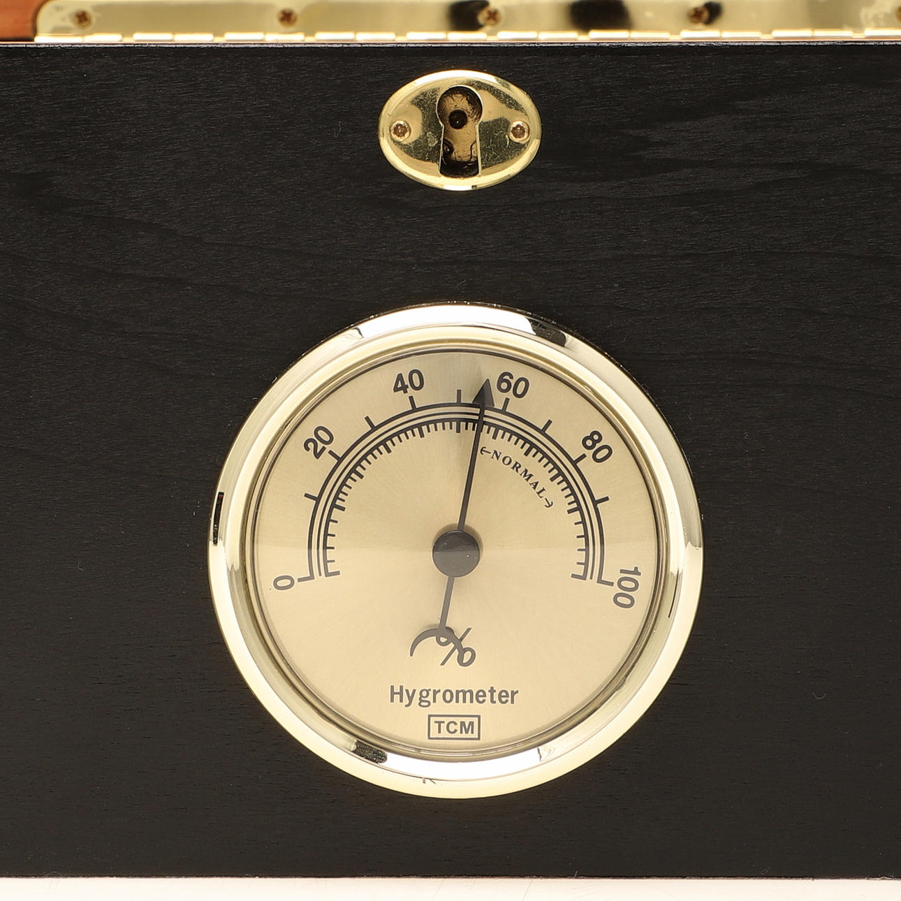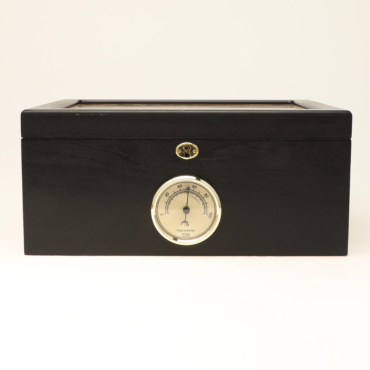 Humidor / Zigarrenetui, Holz. Humidor aus schwarz gefasstem Holz, mit kontrastierenden Verschlüssen und Scharnieren in Goldoptik, oben mit eingelassener Glasplatte, schauseitig mit analogem Hygrometer und Schließmechanismus ausgestattet, innen mit platzsparendem Einlegeboden versehen, dieser zur besseren Sortierung mit einem beweglichen Steg unterteilbar, H.15,5cm, B.34,5cm, T.24cm.
