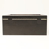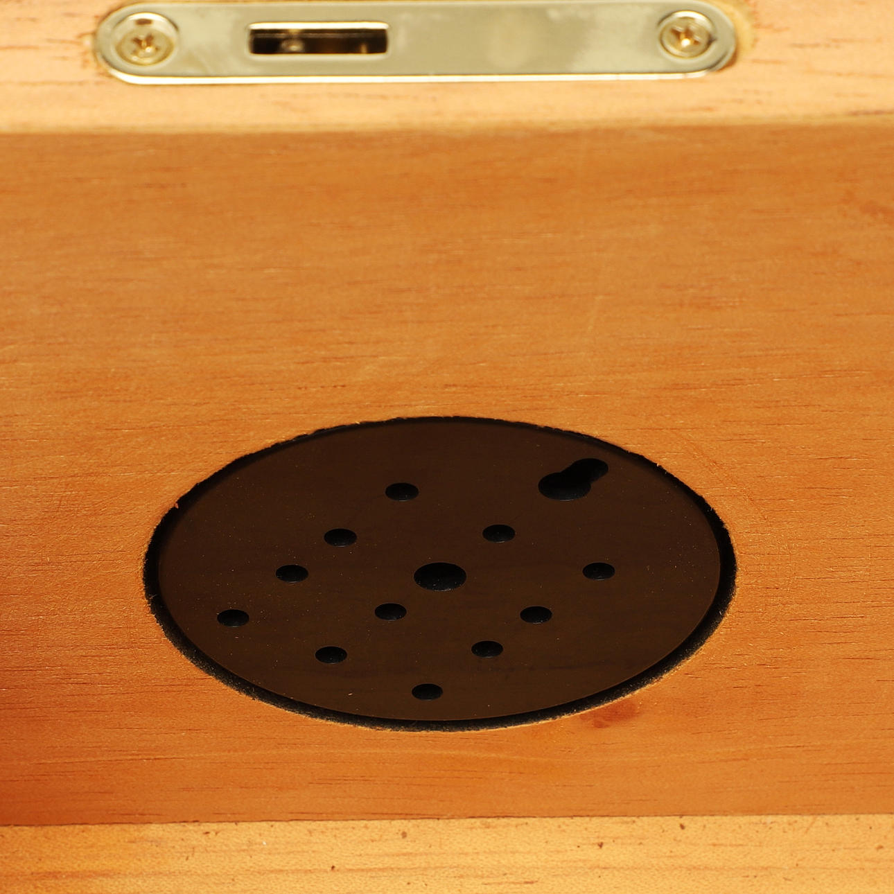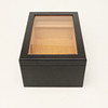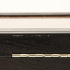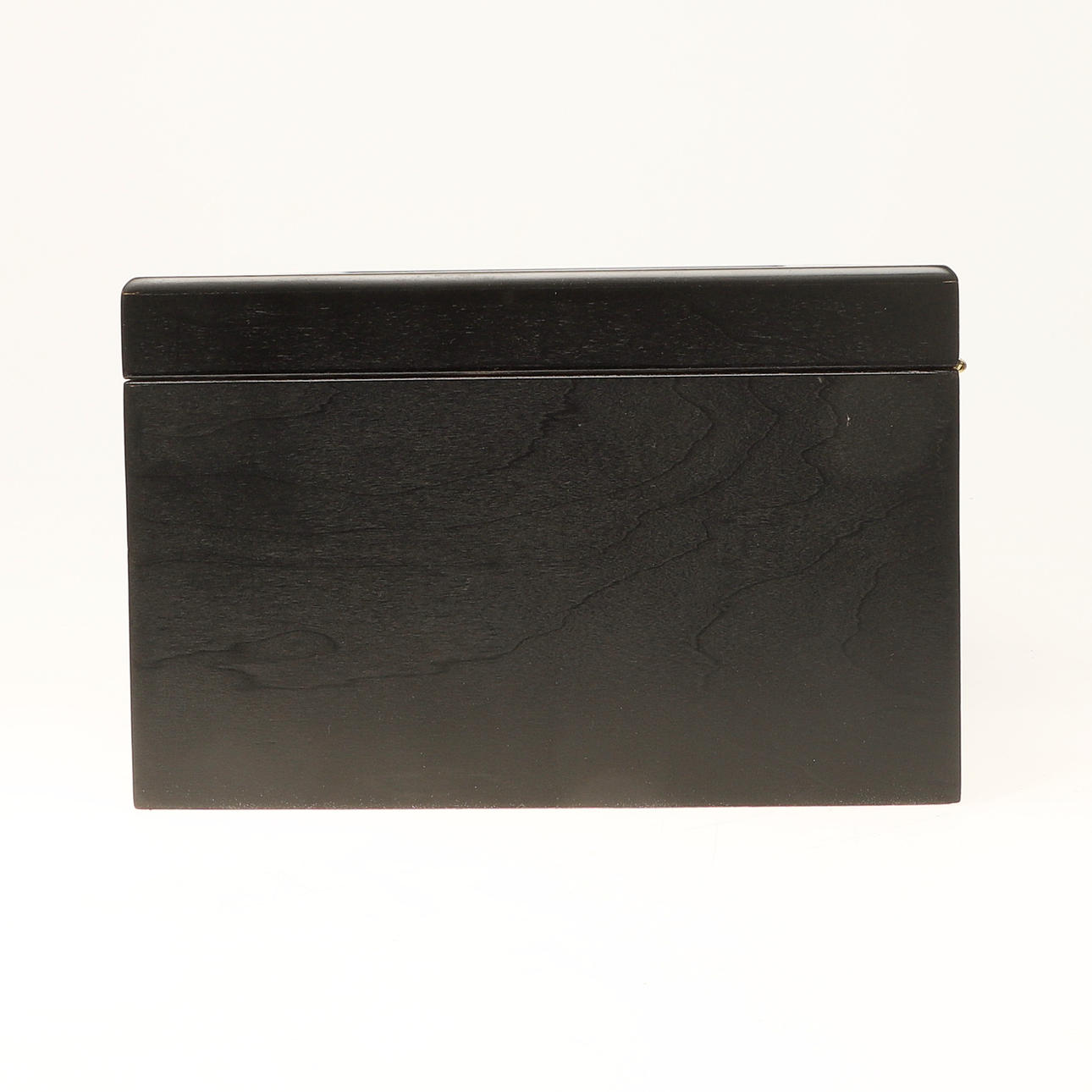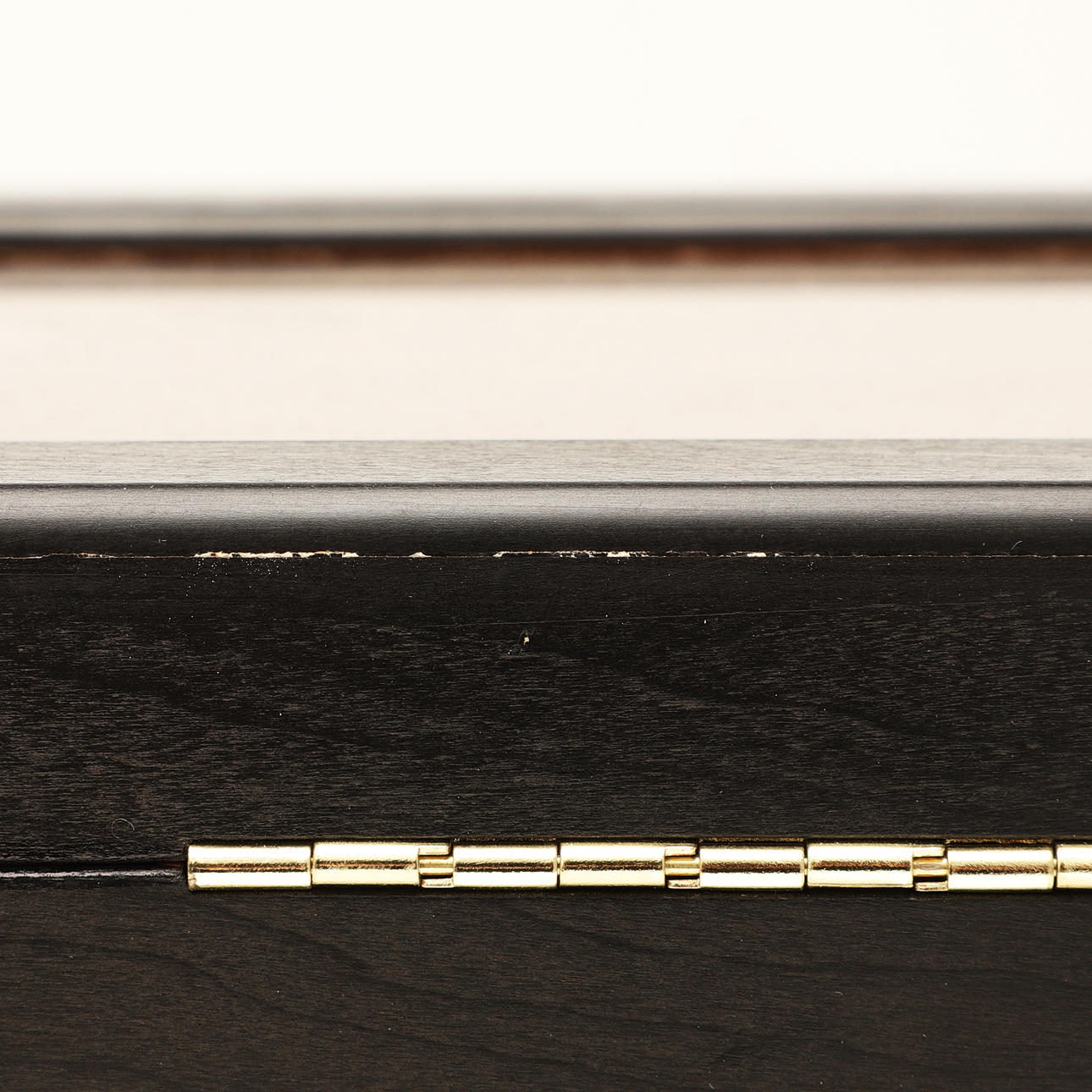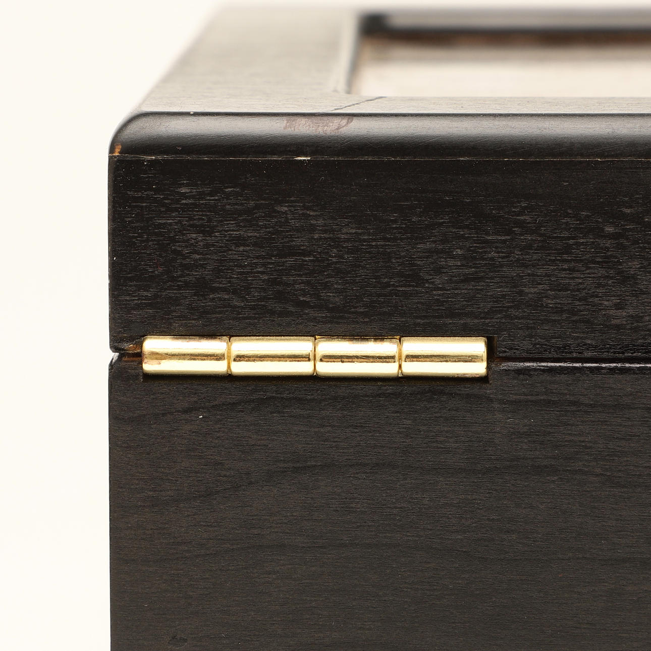Humidor / Zigarrenetui, Holz. Humidor aus schwarz gefasstem Holz, mit kontrastierenden Verschlüssen und Scharnieren in Goldoptik, oben mit eingelassener Glasplatte, schauseitig mit analogem Hygrometer und Schließmechanismus ausgestattet, innen mit platzsparendem Einlegeboden versehen, dieser zur besseren Sortierung mit einem beweglichen Steg unterteilbar, H.15,5cm, B.34,5cm, T.24cm.