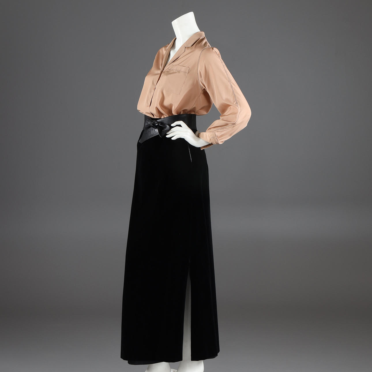 Langer schwarzer Samtrock, 60er Jahre, gerades Modell mit Schlitzen an den Seiten, Verschluss mit Knopf und Reißverschluss. Gekennzeichnete Größe 40 (entspricht ca. 38) Taillenumfang ca. 73-75 cm, Länge ca. 100 cm.