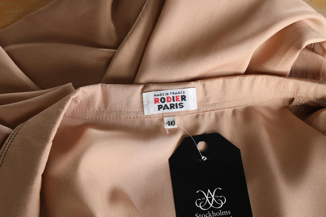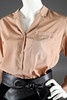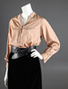 Bluse, Rodier Paris, aus Polyester in hellem Nougat mit kupferfarbenen Metallfäden in den Nähten. 1970er, Größe 40.