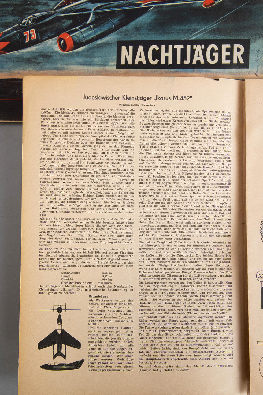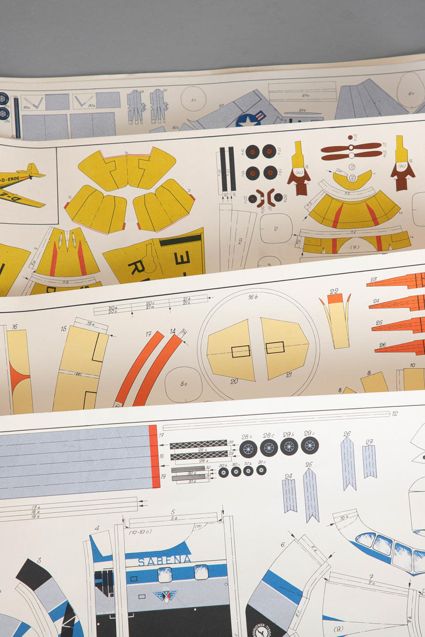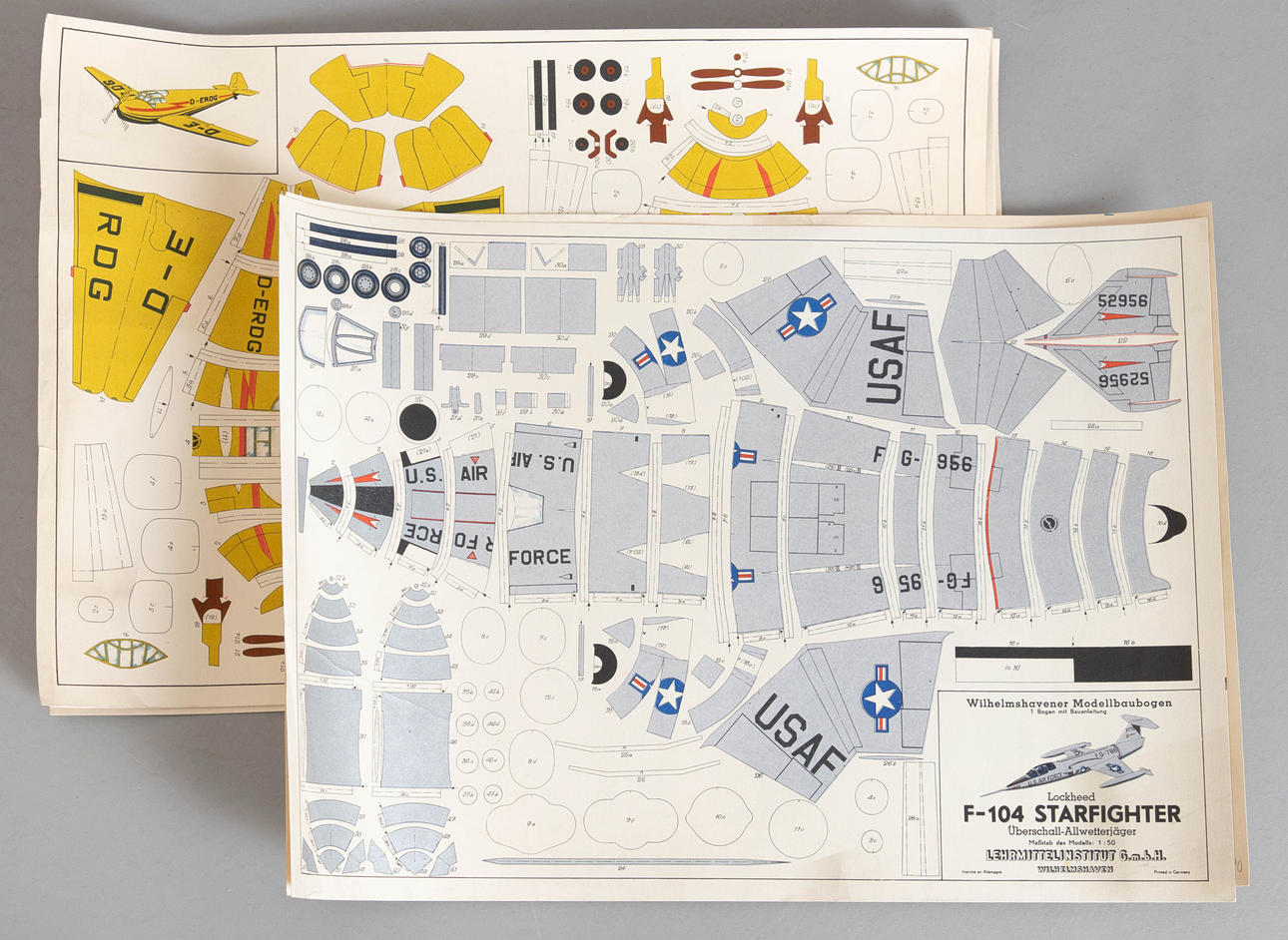 Karton mit farbig lithographiert. In verschiedenen Ausführungen und verschiedener Verlage. 23-tlg., bestehend aus 20 Bögen "Wilhelmshavener Modellbaubogen", Maßstab 1 : 50. Verlag Lehrmittelinstitut GmbH, Wilhelmshaven. 3 Ausschneidebögen, Herausgeber. Zentralrat der FDJ und dem Ministerium für Volksbildung., Verlag Junge Welt, Berlin.