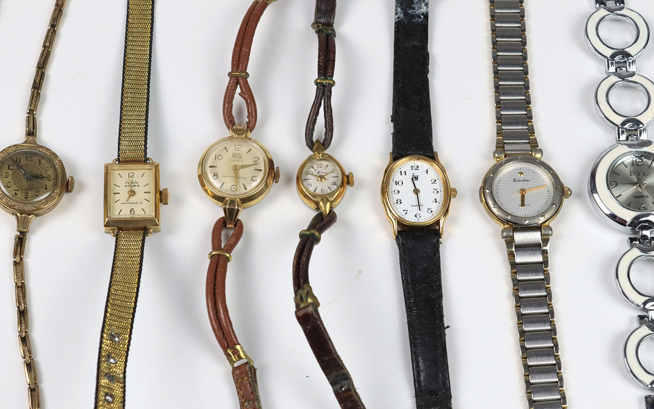 in verschiedenen Ausführungen und Erhaltungen, dabei 8 Stück mit Handaufzugswerk, davon laufen 6 Stück an, Ruhla, UMF Ruhla, Cuaba u.a. dazu 6 teils als Schmuckuhren ausgeführte mit Quartzswerken, ges. 14 Stück.