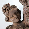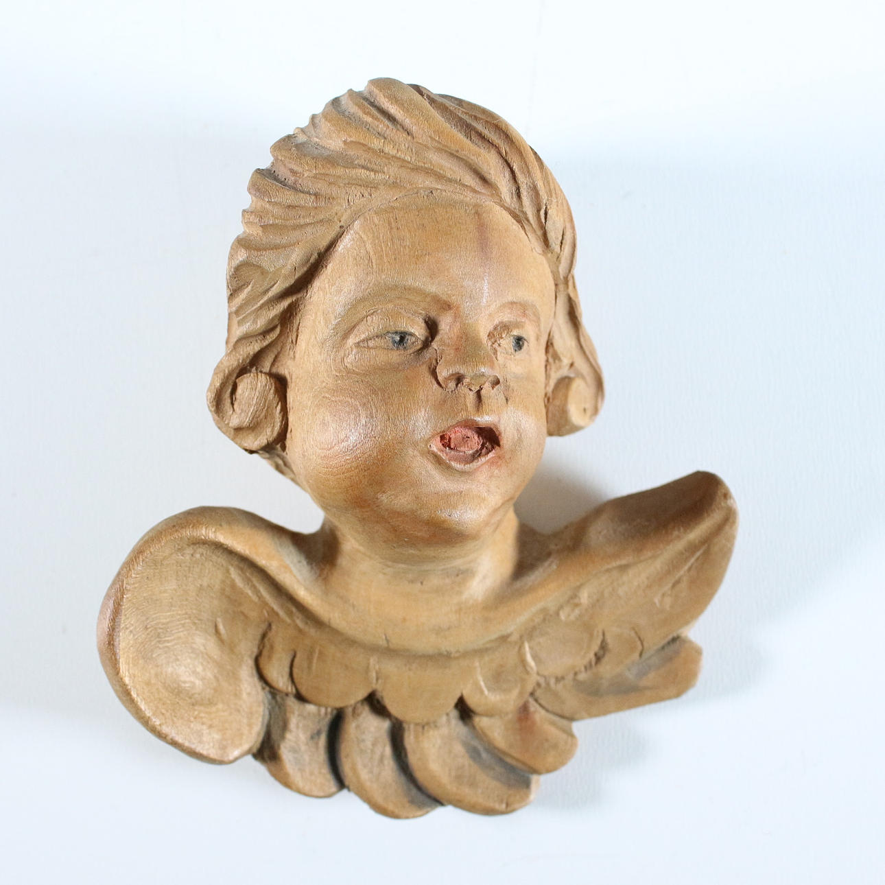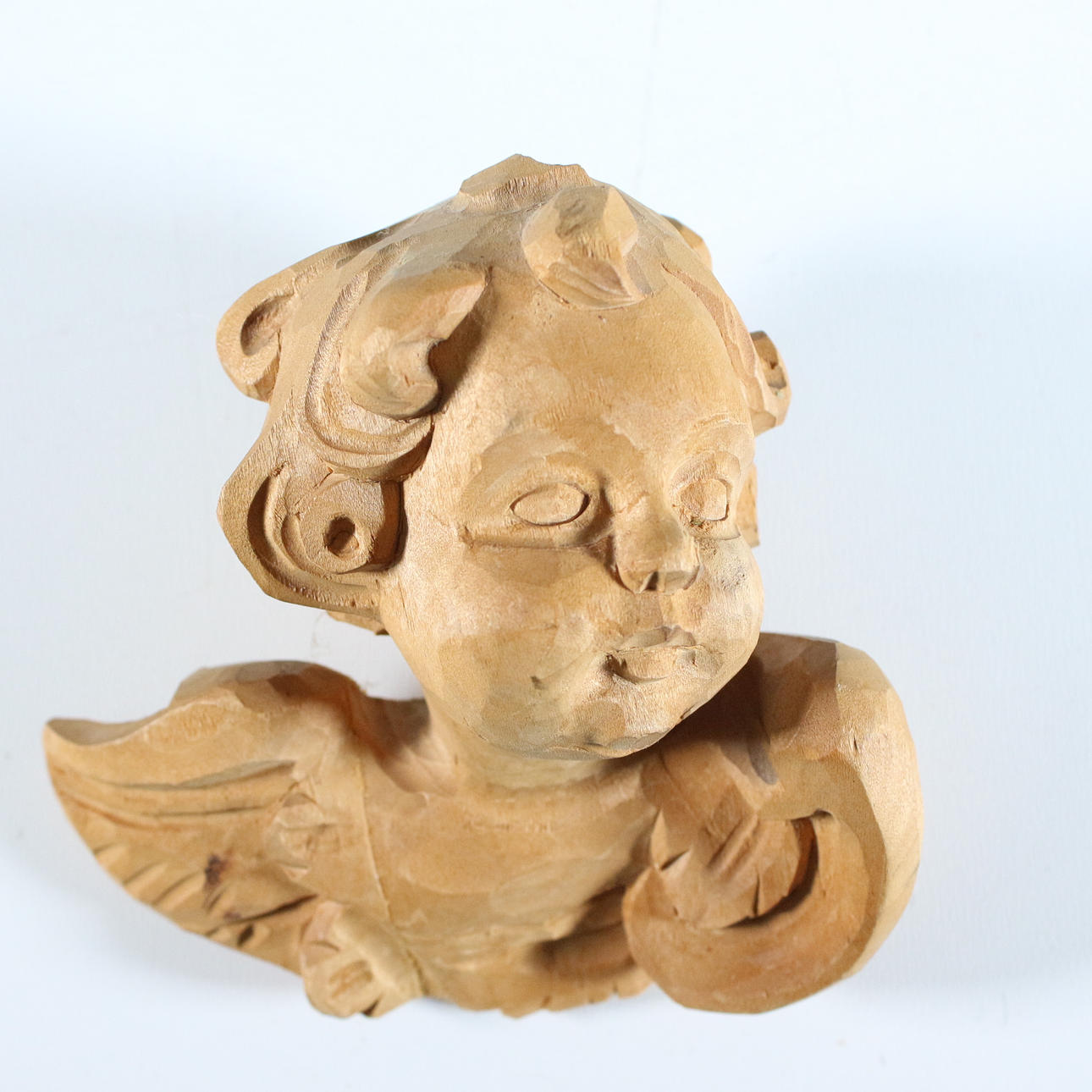 Engel, Skulpturen, geschnitztes Holz, 4 Stück, Maße ca.: Engel: H. 19 cm, B. 9 cm; Köpfe: H. 10 cm, B. 10 cm.