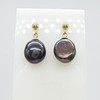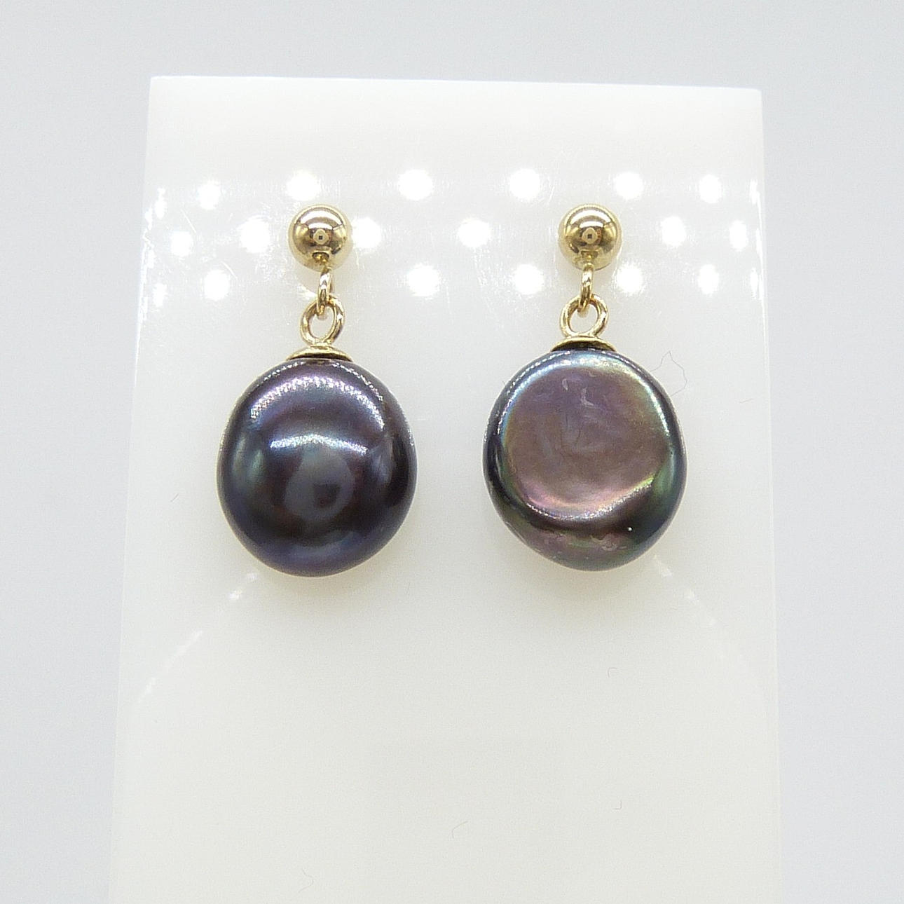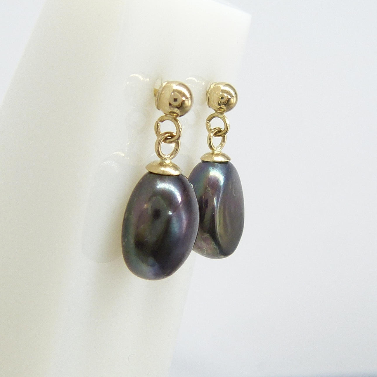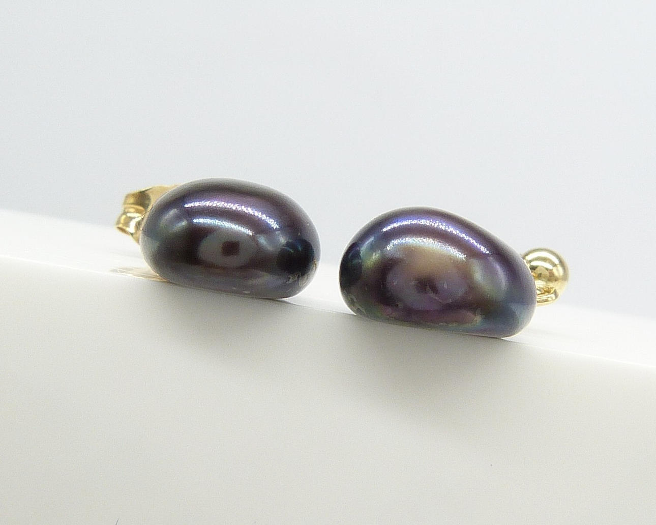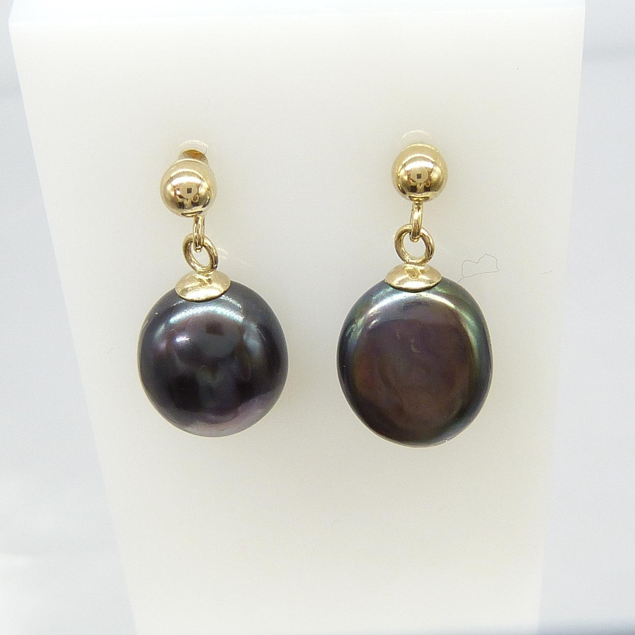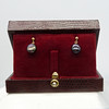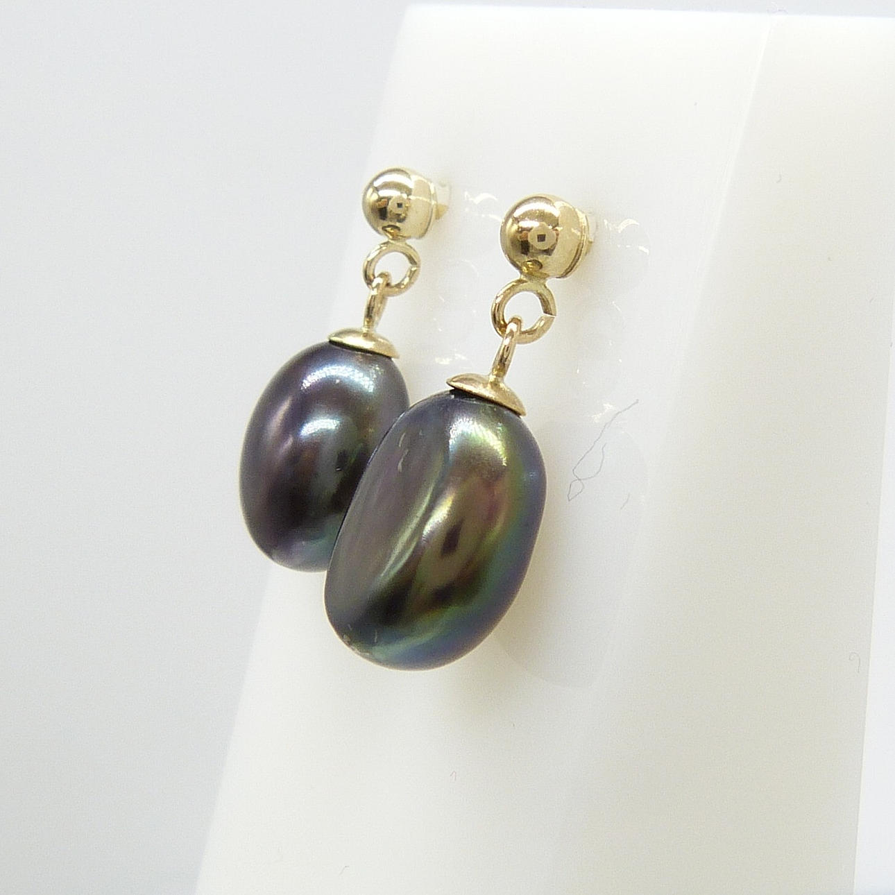 Ein Paar Ohrstecker aus 9 Karat Gelbgold, besetzt mit schwarzen Perlen in Malven- und Grüntönen, verpackt.
