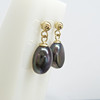 An jedem Ohrring dieses Paares hängt eine organisch geformte schwarze Perle mit Malven- und Grüntönen.