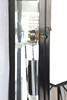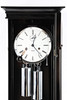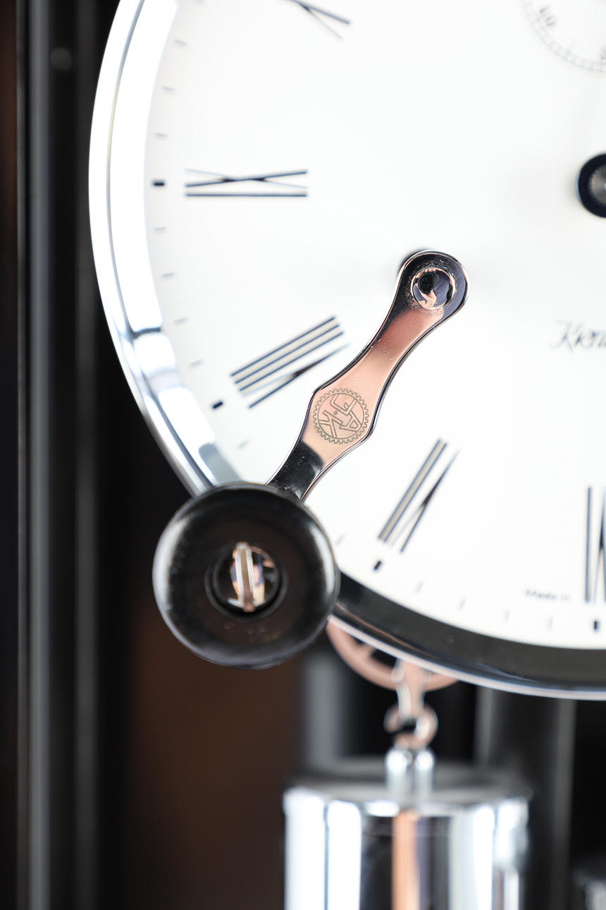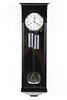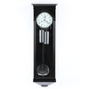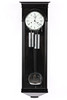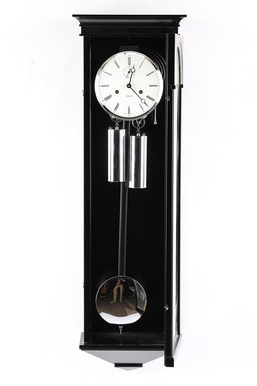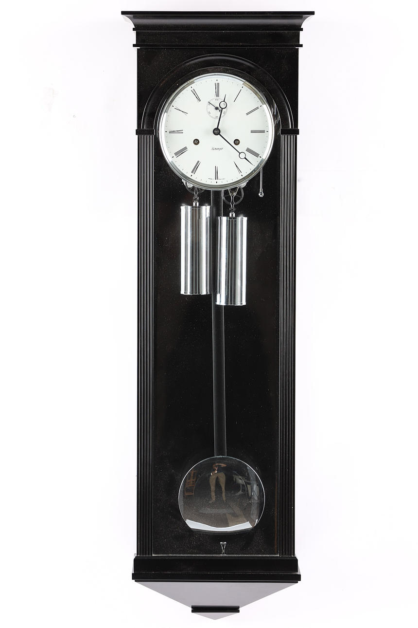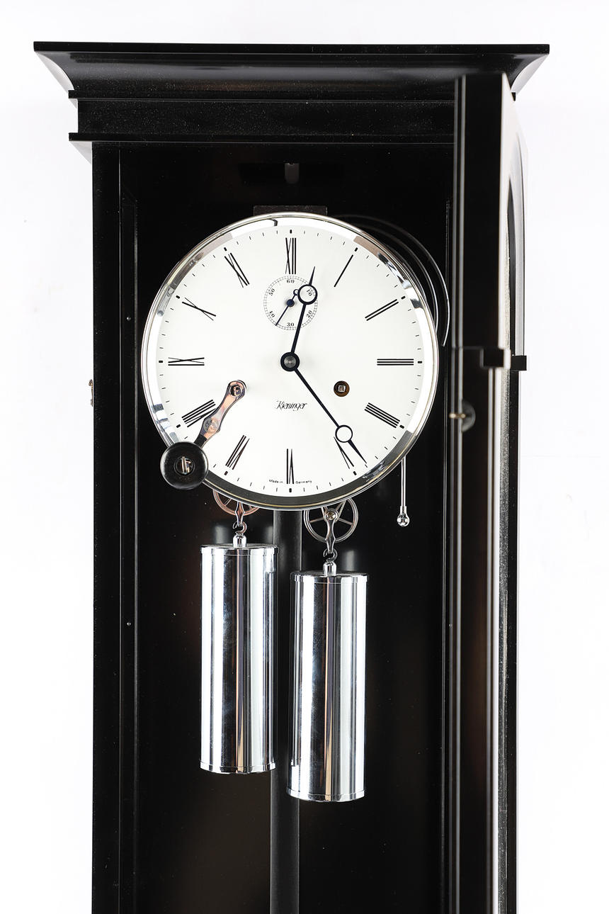 Kieninger, Wanduhr / Regulator, Holz, Glas. Pendelwanduhr, Korpus aus schwarz lackiertem Holz mit dreiseitiger Verglasung und Flankpilastern, abgeschlossen durch einen Arkadenbogen im klassizistischen Stil, versehen mit weißem Ziffernblatt mit römischer Bezifferung, beiliegend mit zwei Gewichten und einem Pendel, sowie einem Schlüssel, H.89cm, B.30cm, T.17cm.