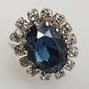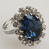 Weißbronze/Tombak, rhodiniert, funkelnder Kristallbesatz (transparent/blau), Swarovski-Steine bzw. Gablonz, Ringkopf ca.2,2x1,7cm, Ringgröße individuell verstellbar (offene sehr flexible Ringschiene).