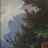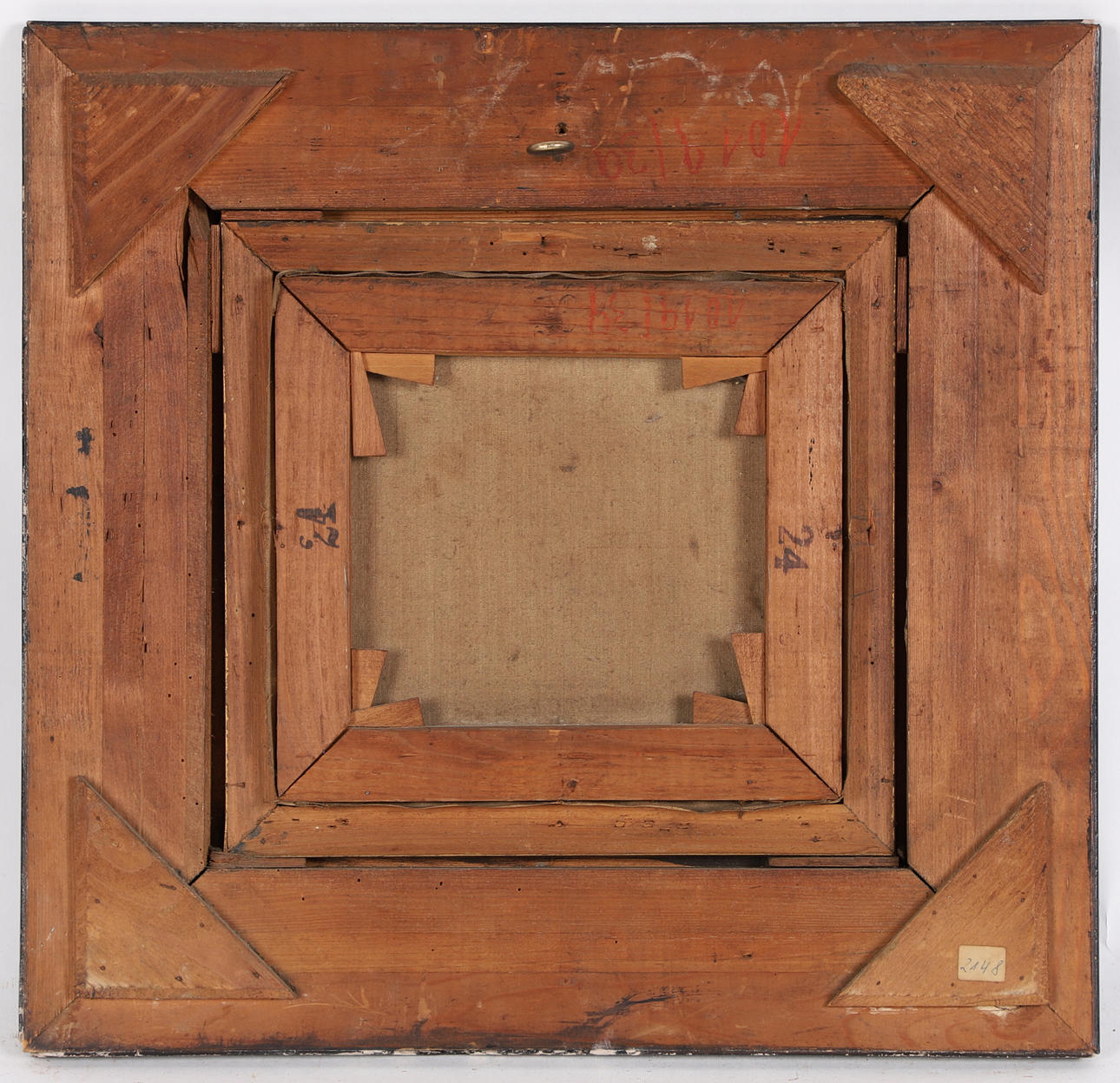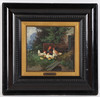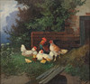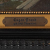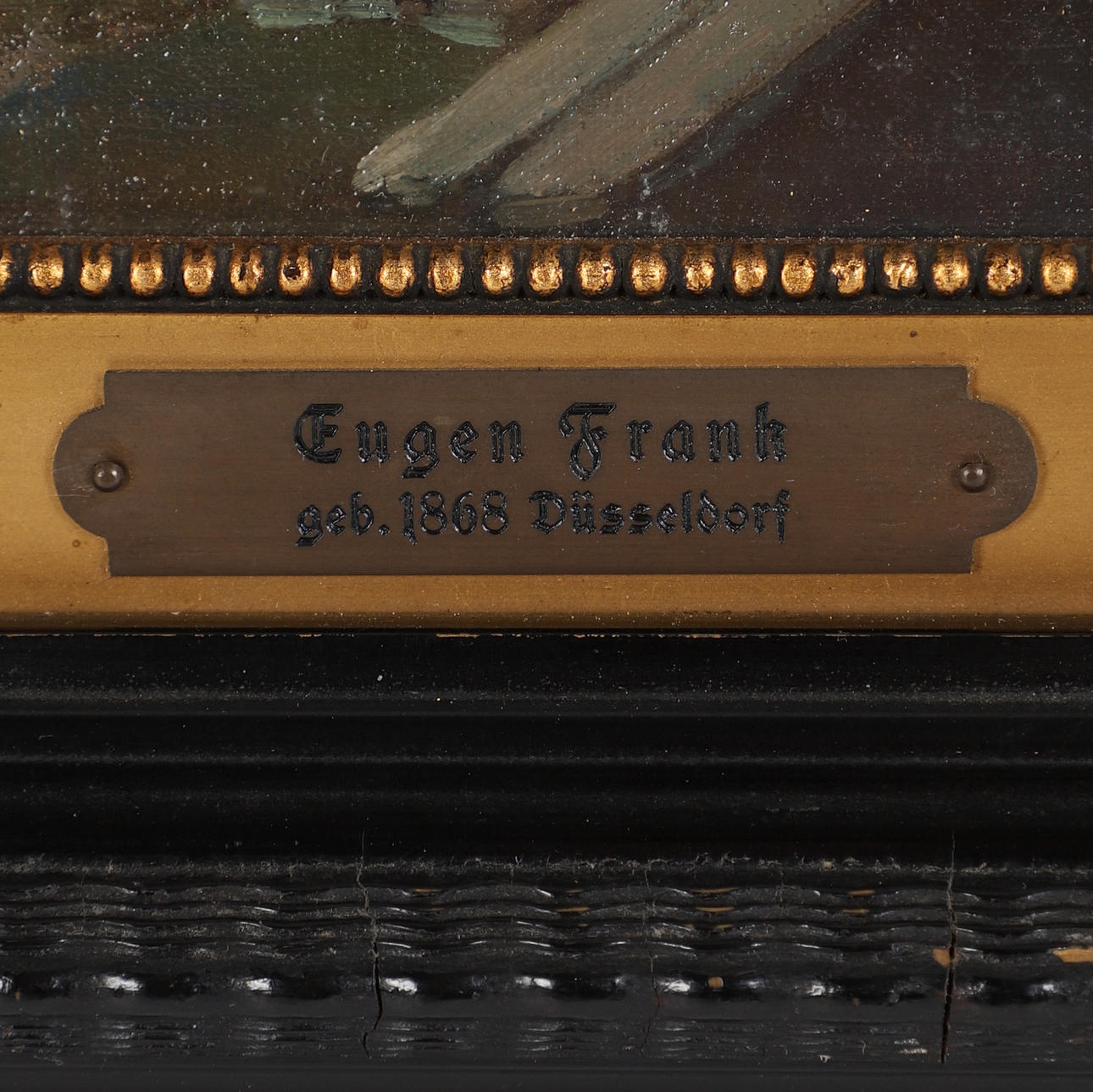 Eugen Frank (1868-?), Gemälde, Landschaft mit Hühnern, Düsseldorf. Darstellung von Hennen und Küken mit einem Hahn vor einem Bauernhaus im frühlingshaften Exterieur, unten rechts signiert, sowie unten am Rahmen bezeichnet, 23x24cm (48x50cm).