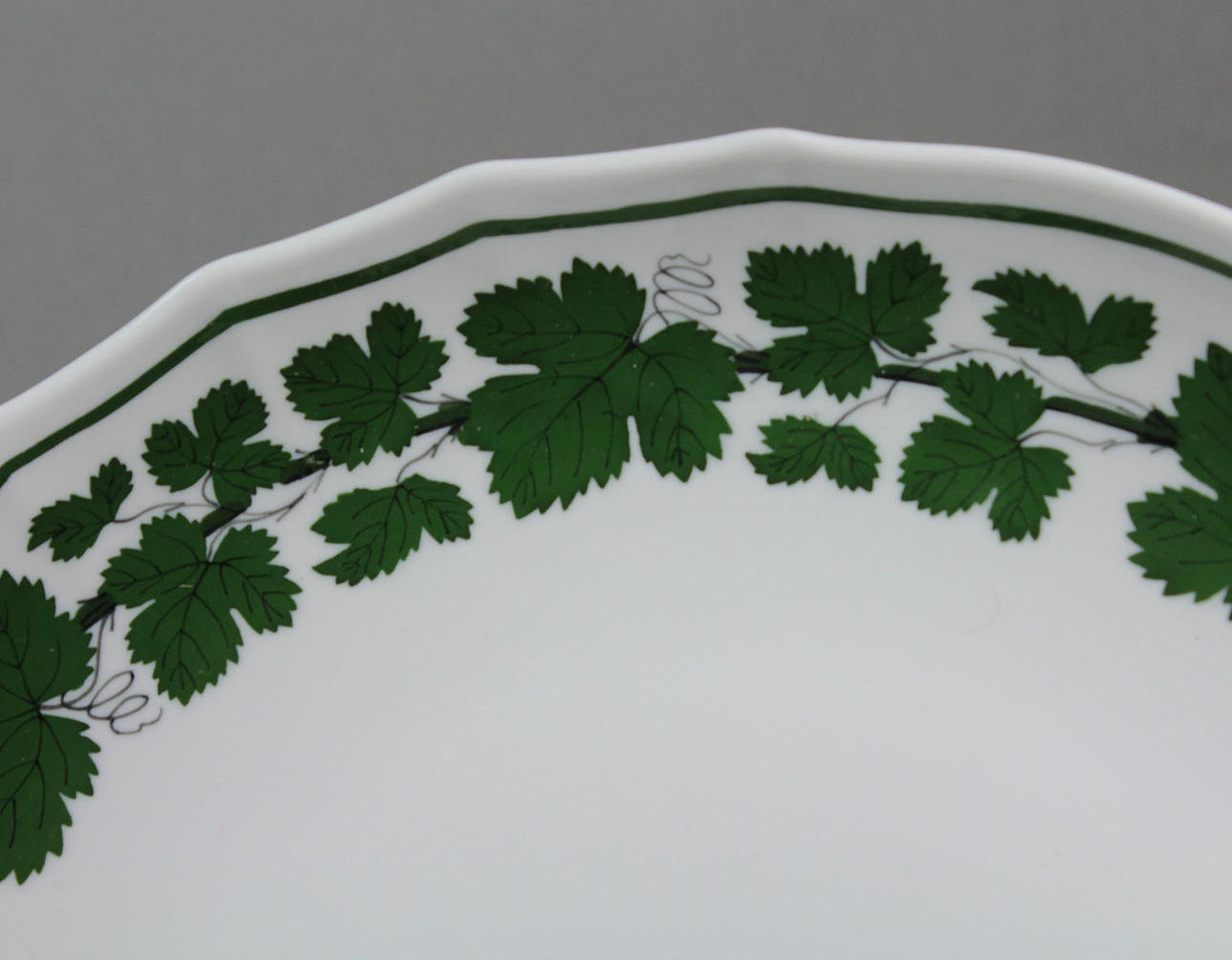 Porzellan mit unterglasurblauer Schwertermarke der Porzellanmanufaktur Meissen nach 1934, mit 3 Schleifstrichen, Preß- u. Malernr., Form Neuer Ausschnitt mit gewellt, gezipfeltem Rand, Ø ca. 28 cm, mit unterglasurgrünem Weinreben Dekor.