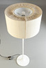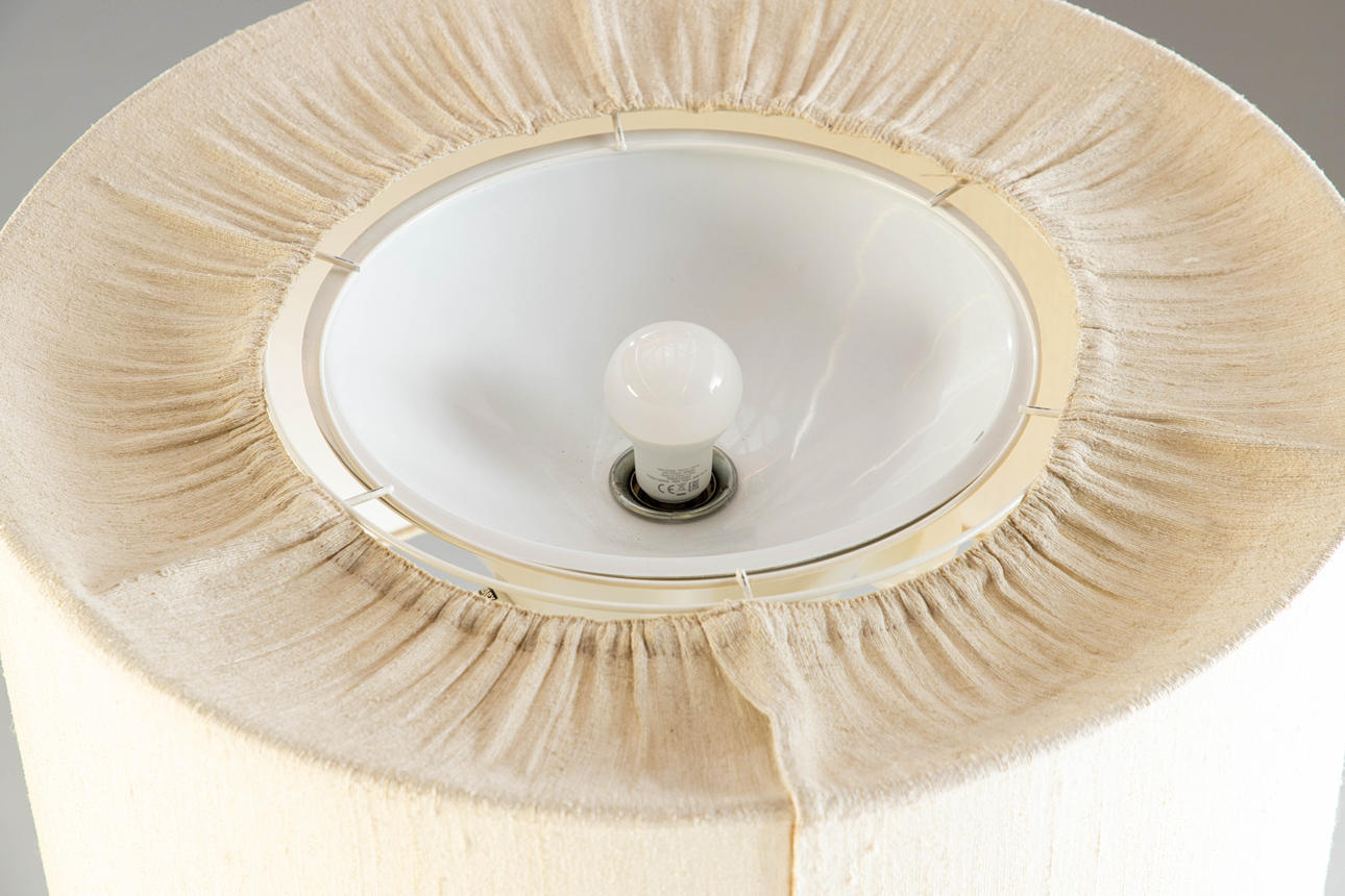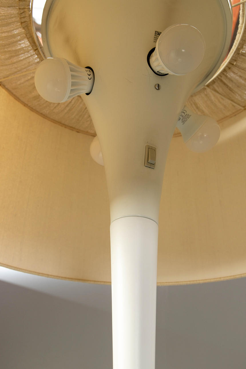 Creme-weiß lackiertes Metall. Beiger Lampenschirm. 5-flammig. H. 152 cm, Ø 60 cm.