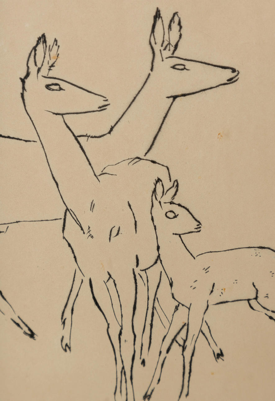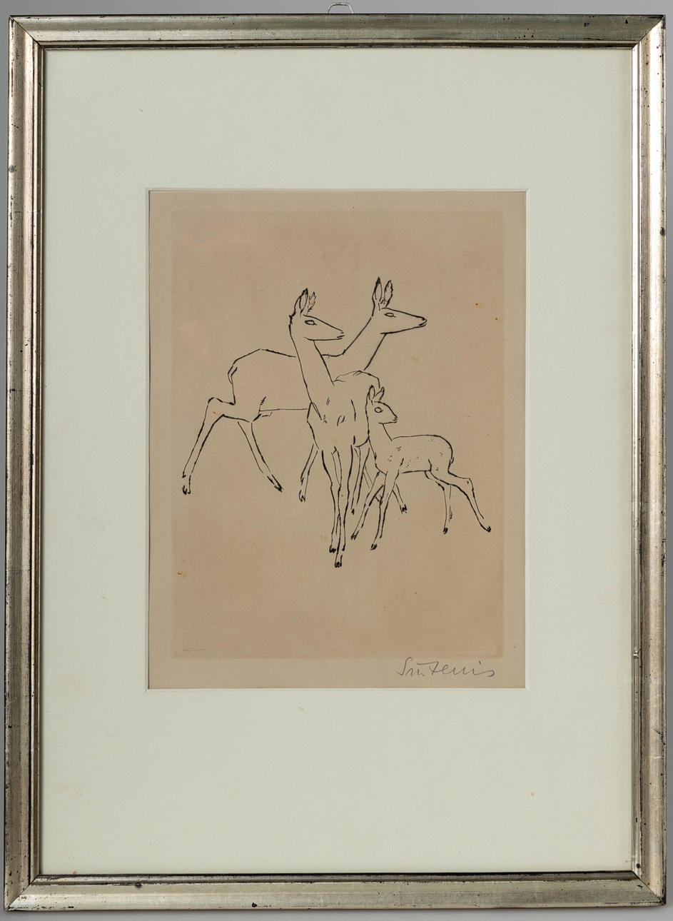 Renée Sintenis(1888-1965), Rehe, Radierung,um 1920, signiert, ca. 23,5 x 17,5 cm, hinter Passepartout und Glas gerahmt, mit Rahmen ca. 47 x 35 cm.