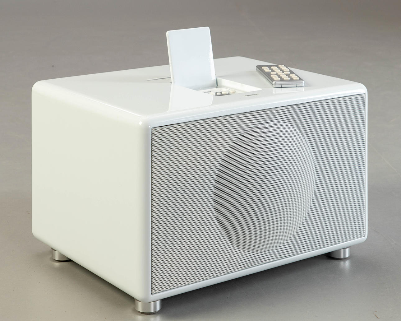 IPod-Dock, CD-Laufwerk und Radio. Gehäuse in weiß. Fernbedienung und Kabel sind vorhanden. HxBxT: 28x45x36cm.