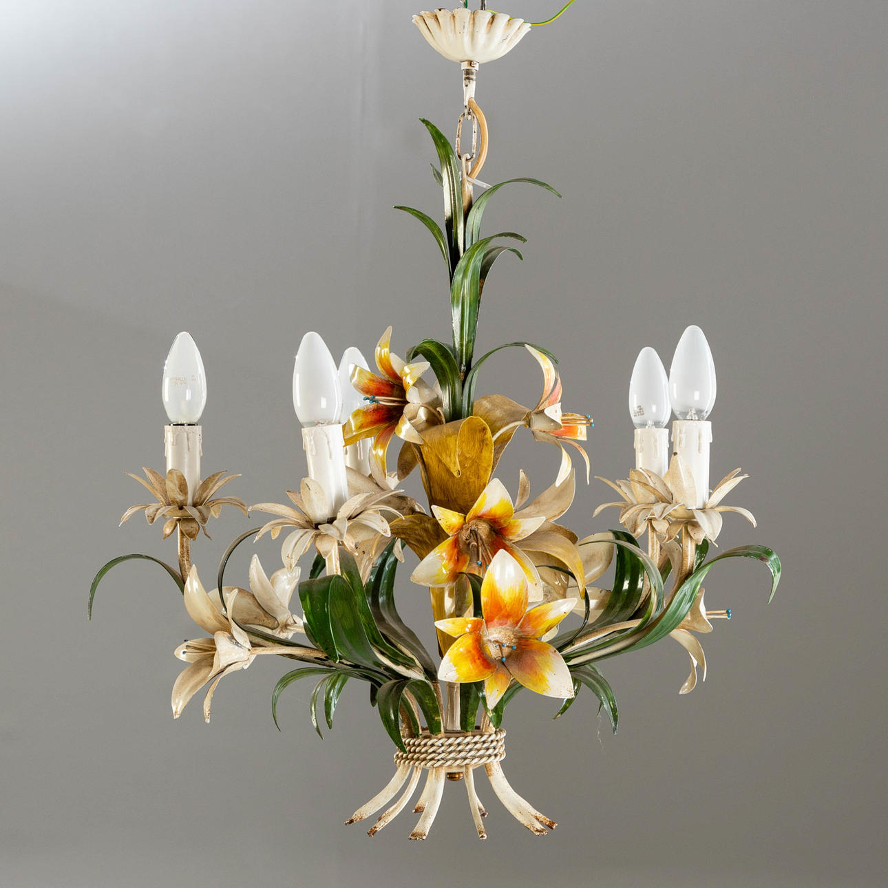 Leuchtkörper als gebündeltes Bouquet. Metall, farbig gefasst. 5-flammig, elektrifiziert. H. 54 Ø 54 cm.