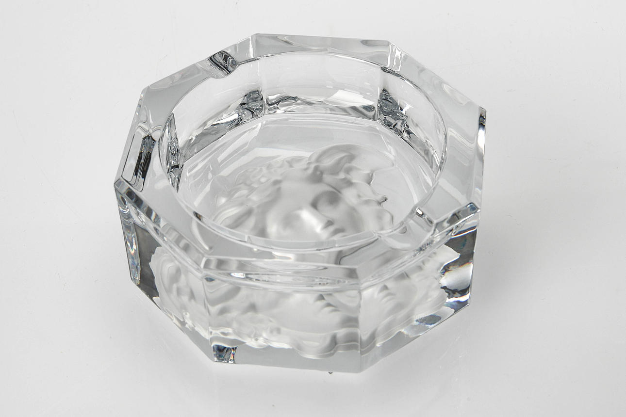Achteckig, Höhe 6,5 cm, ca. 16x16 cm, unten geätzter Medusenkopf im Reversrelief.