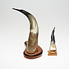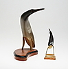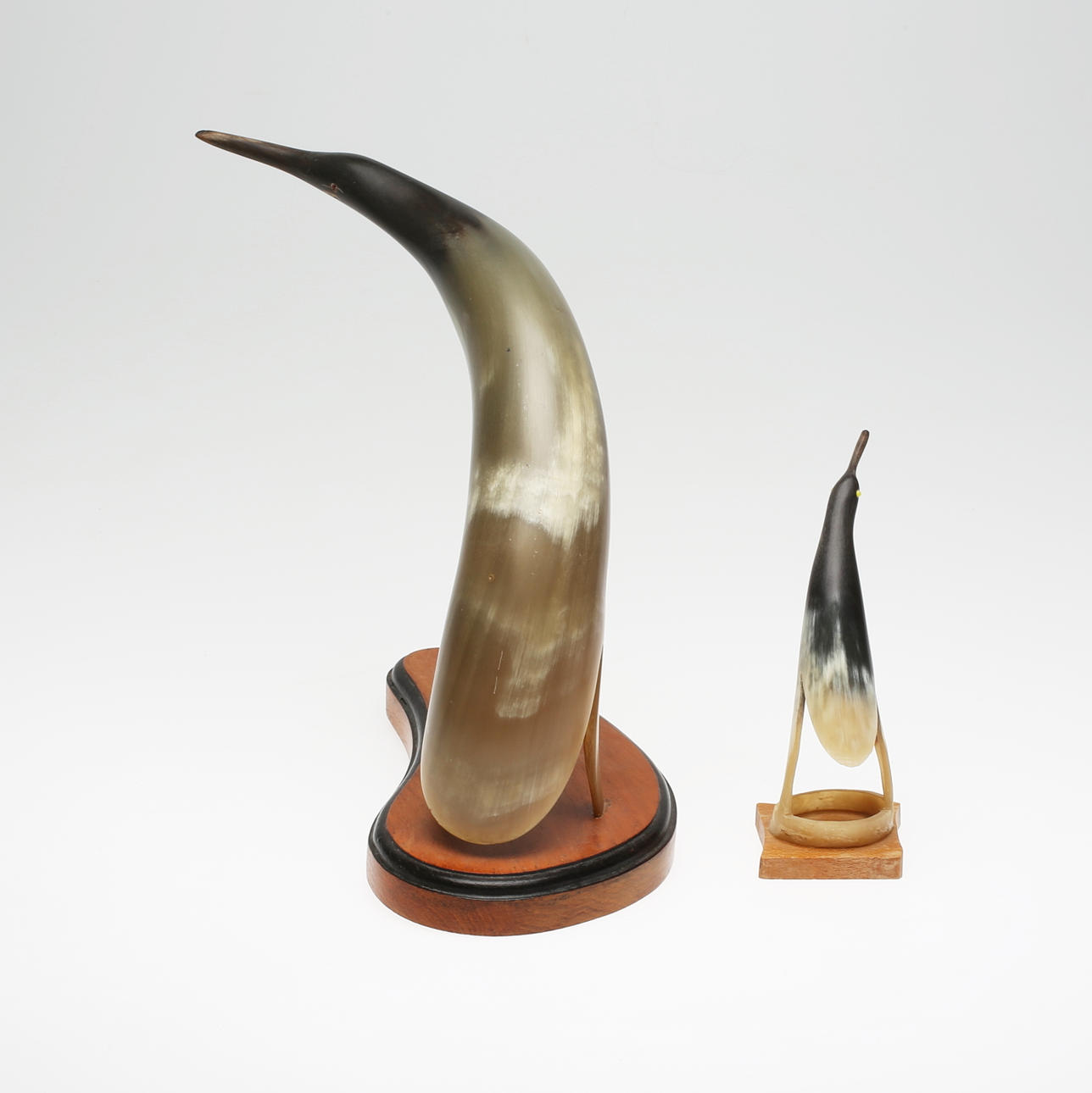 Vögel in geschnitztem Horn auf Holzplatte. 27 bzw. 19 cm Höhe.
