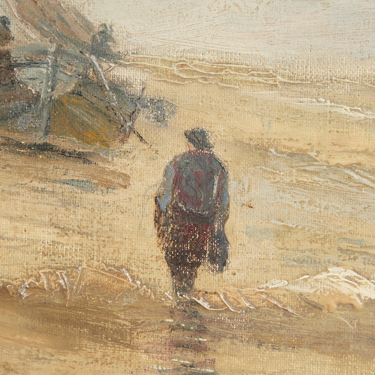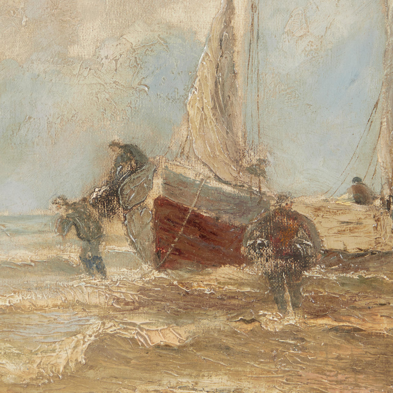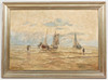 Hans Wacker-Elsen (1868-1958), Gemälde, Seestück, Öl auf Leinwand, 19. Jahrhundert. Darstellung eines bewölkten Exterieurs mit mehreren Fischerbooten und Fischern in einem Gewässer, unten links signiert, pastoser Farbauftrag, 65x94cm (80x109cm).