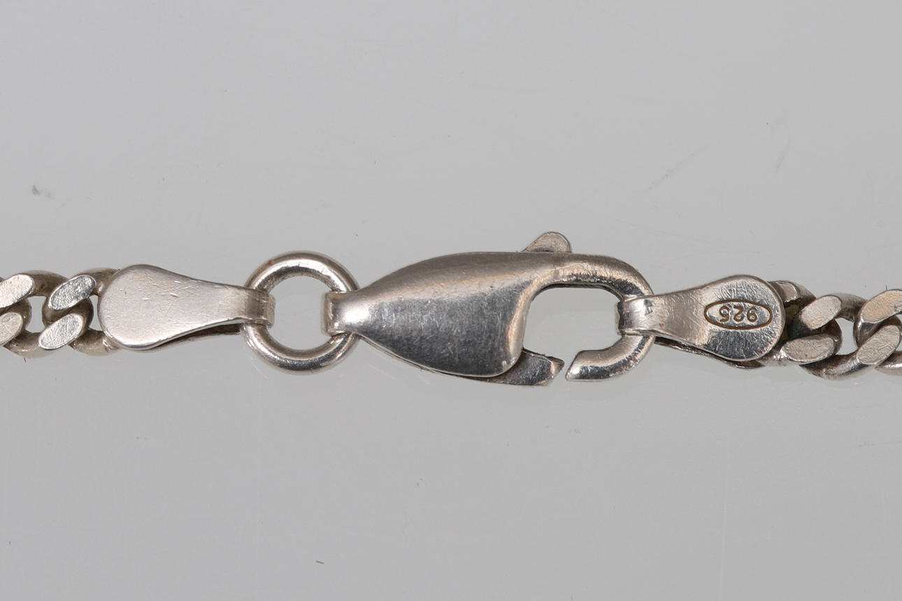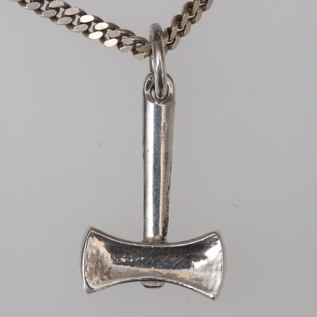 Anhänger, Hammer, ca. 34x18 mm. Kette, gepanzertes Glied, ca. 40 cm lang, ca. 3 mm breit. Gewicht ca. 16,7 Gramm.