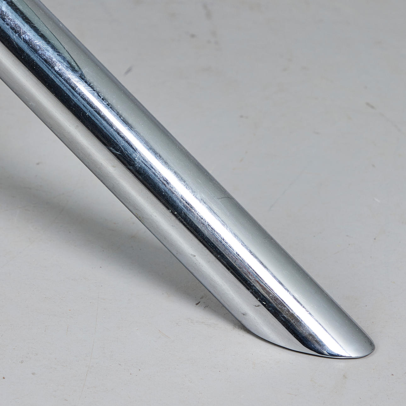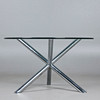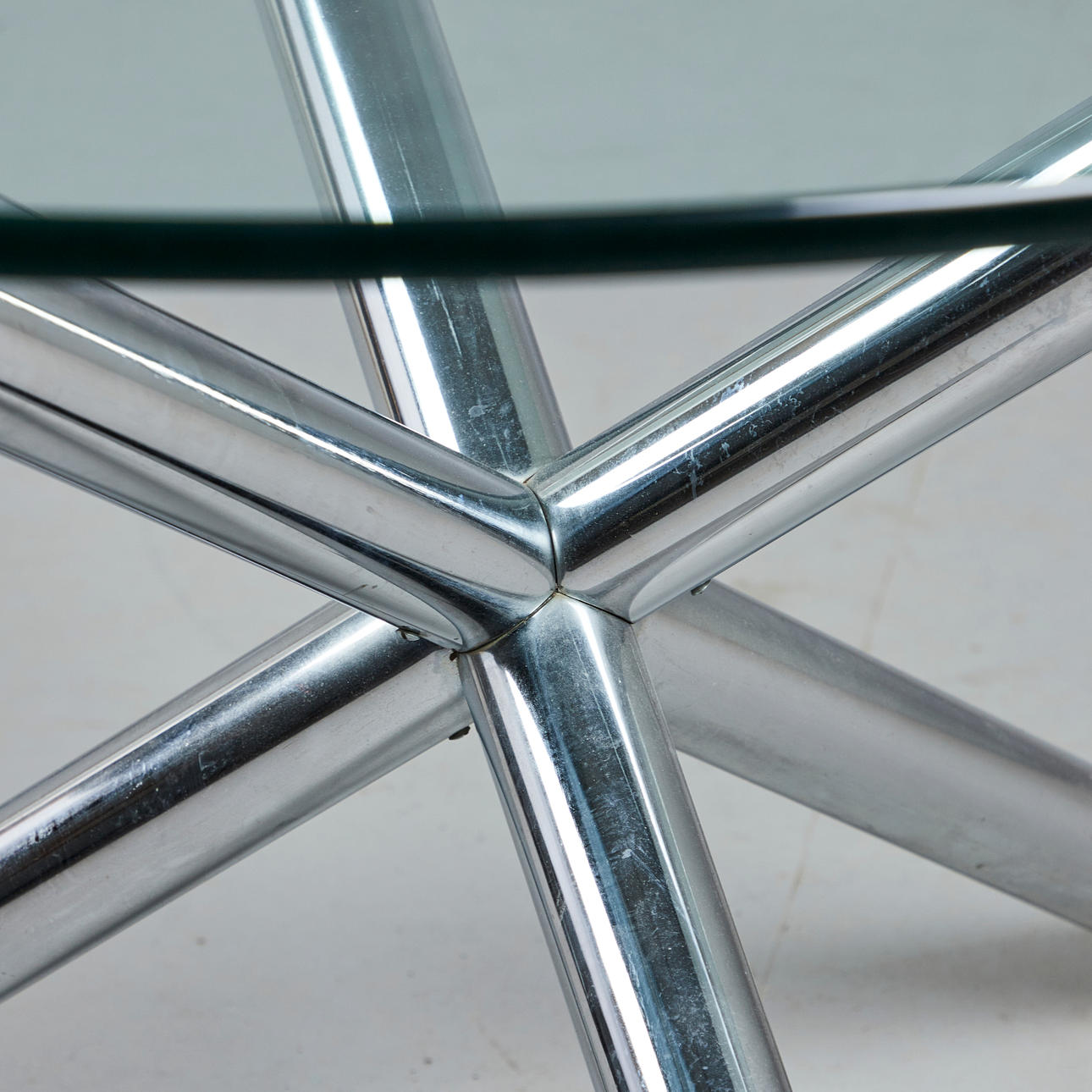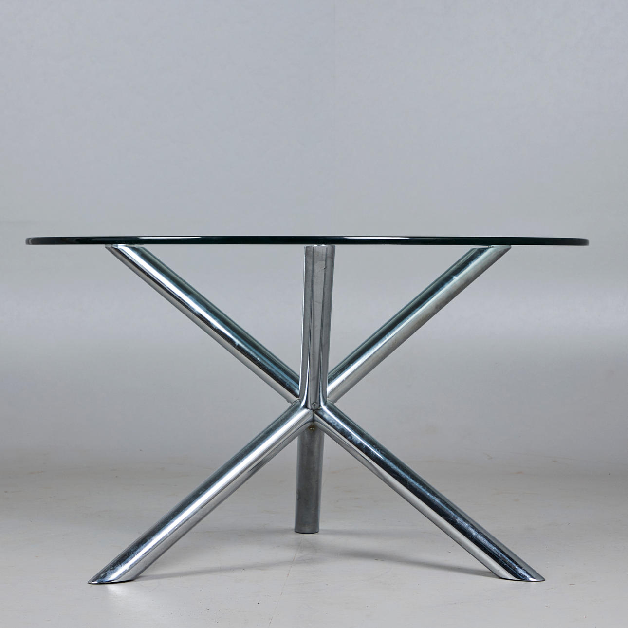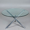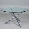 Tisch / Esstisch, Chrom, Glas. Esstisch mit einem skulpturalen Untergestell aus verchromtem Metall und einer lose aufliegenden, runden Tischplatte aus Glas, H.71cm, D.120cm.