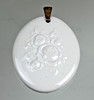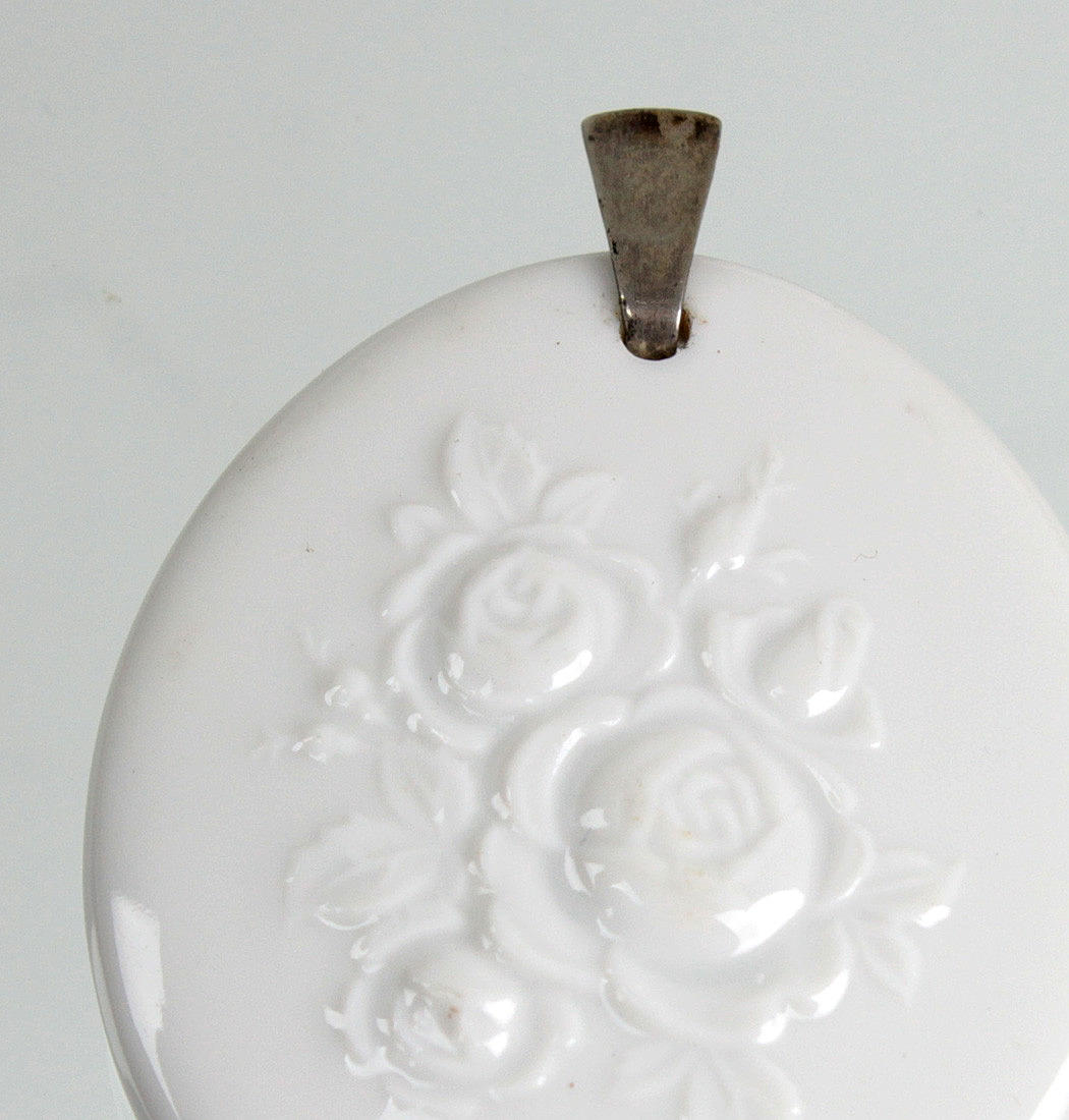 Porzellan mit unterglasurblauer Schwertermarke der Porzellanmanufaktur Meissen nach 1945, 1. Wahl, ovaler Anhänger mit Rosenblütenrelief verziert, ca. 3,8 x 4,6 cm, Trageöse punziert Silber 835.