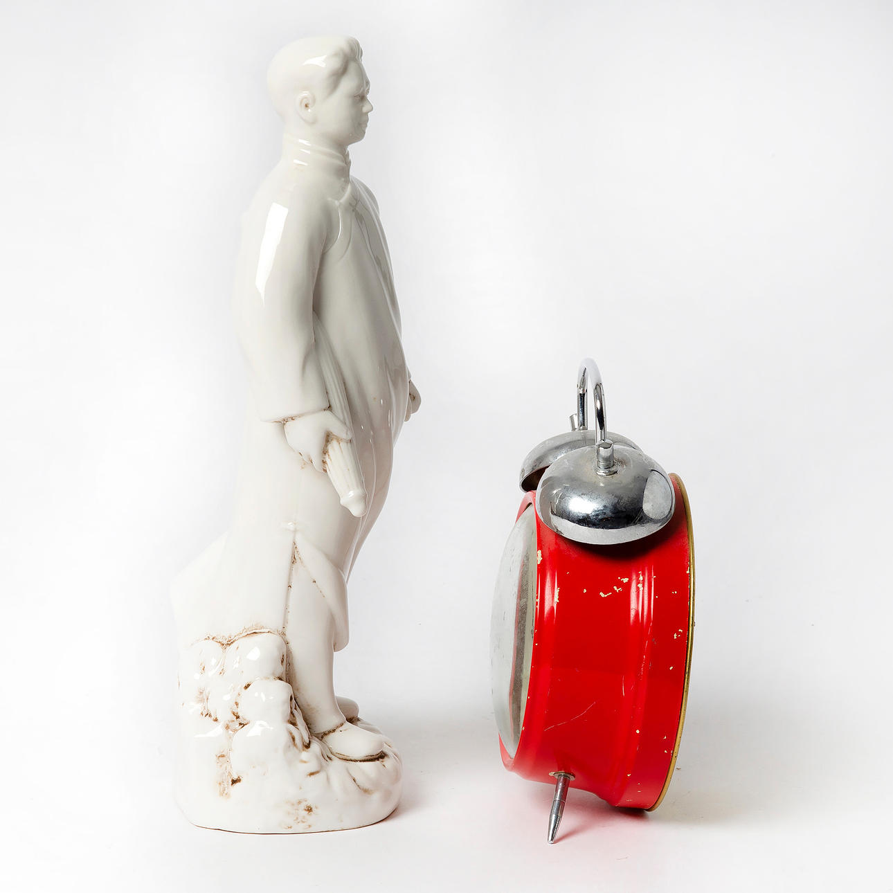 Die Figur, die Mao Zedong darstellt, Höhe 28 cm. Wecker mit politischer Szene auf dem Zifferblatt, Höhe 17 cm.