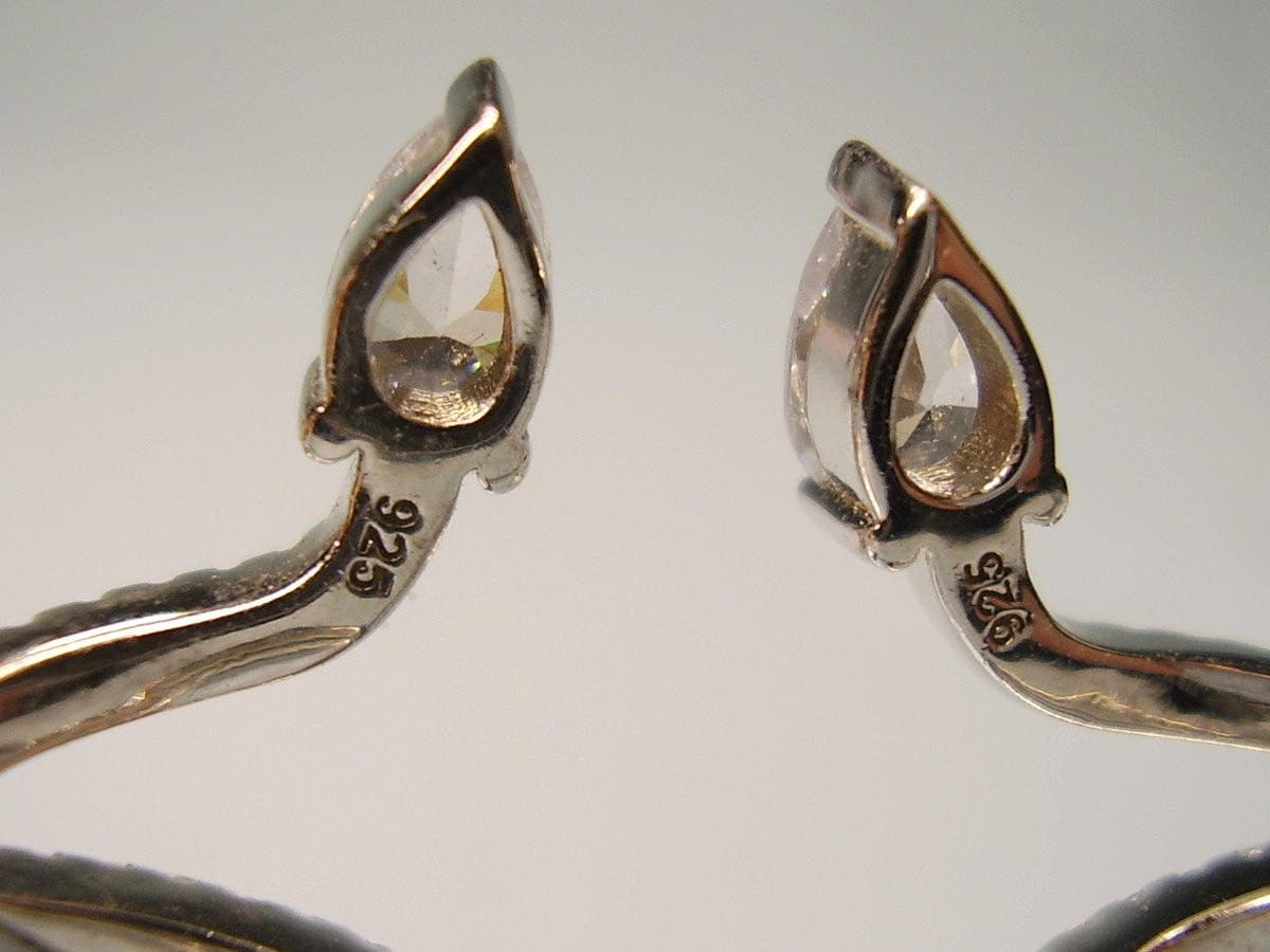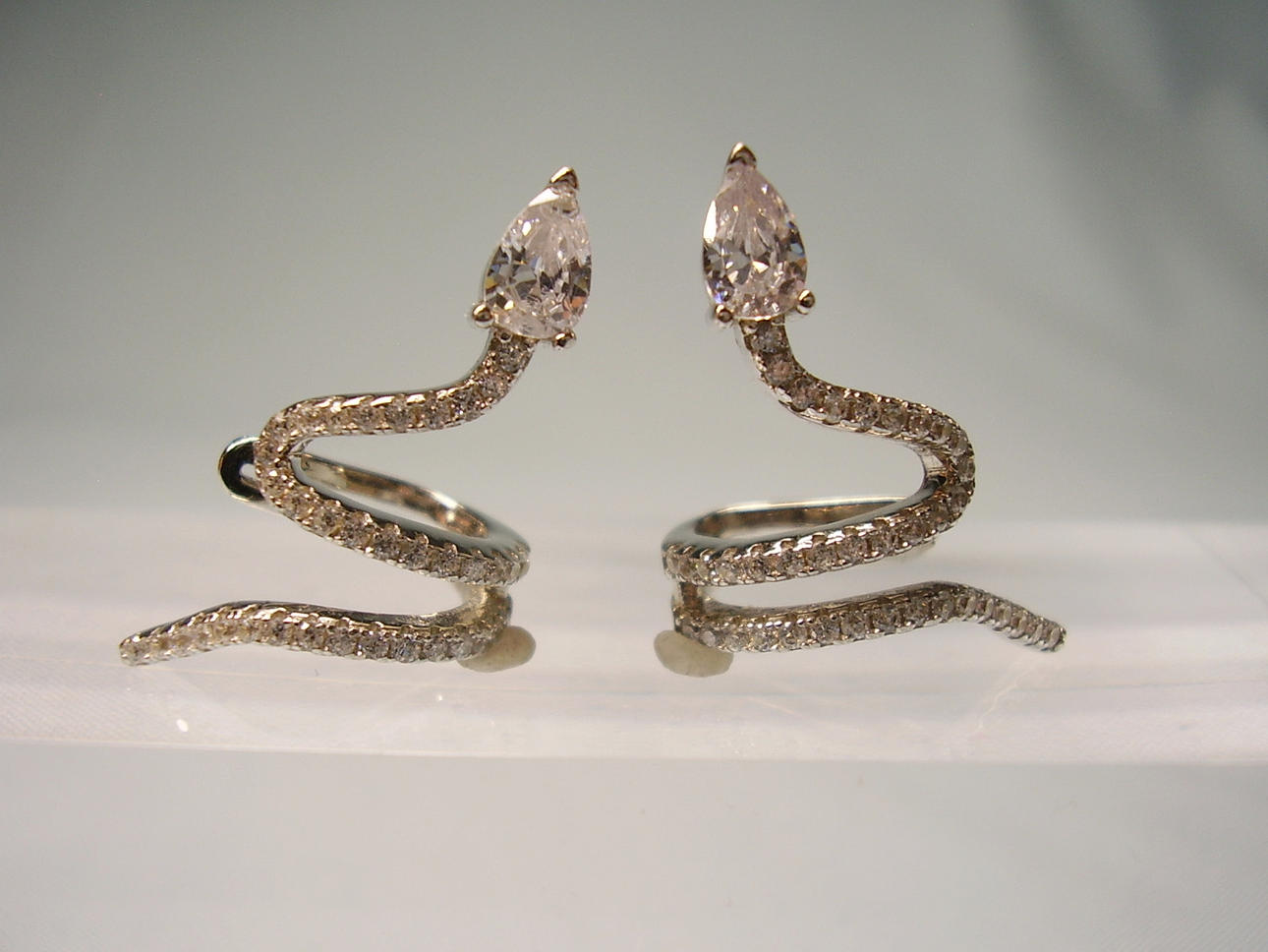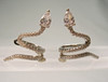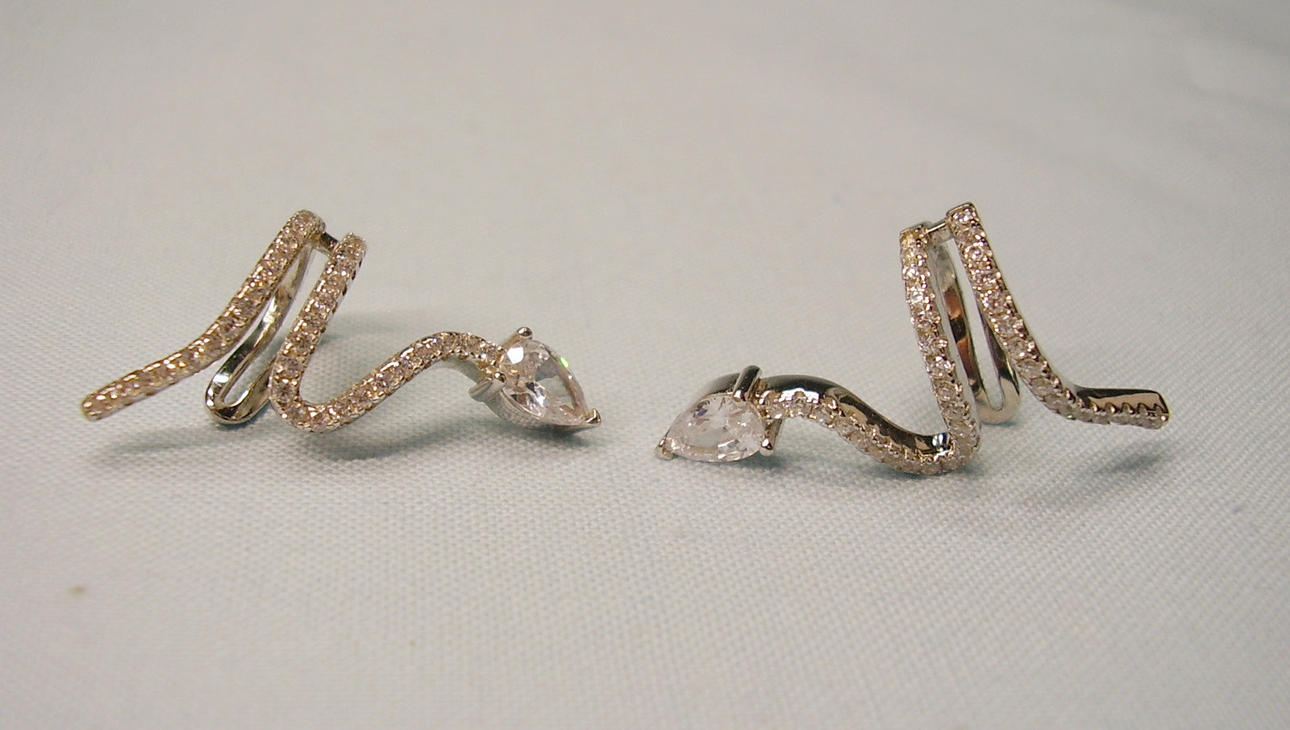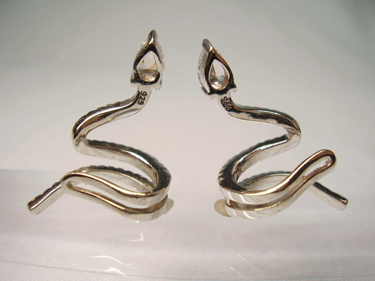 Die Ohrringe sind in Silber 925 gearbeitet und so punziert. Sie sind als sich windende Schlangen ausgeführt, die mit facettierten Zirkonia besetzt sind. Als Schlangenkopf ist ein tropfenförmiger Zirkonia eingesetzt. Die Ohrringe werden über die Ohrmuschel gesteckt.