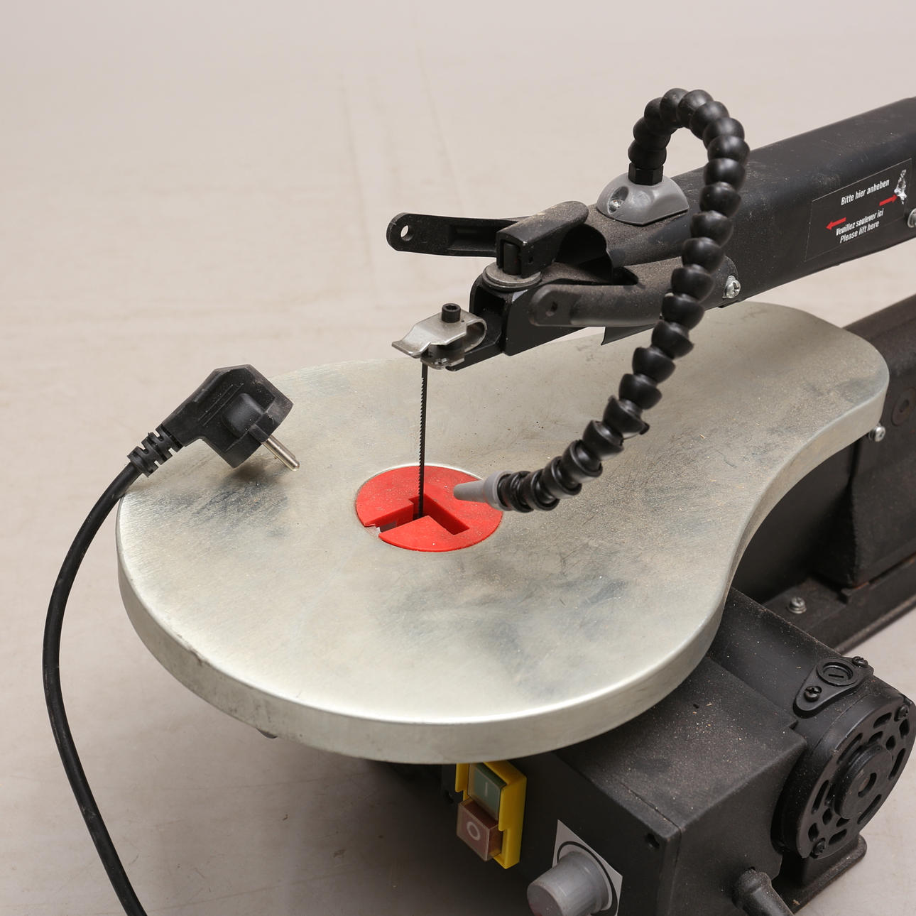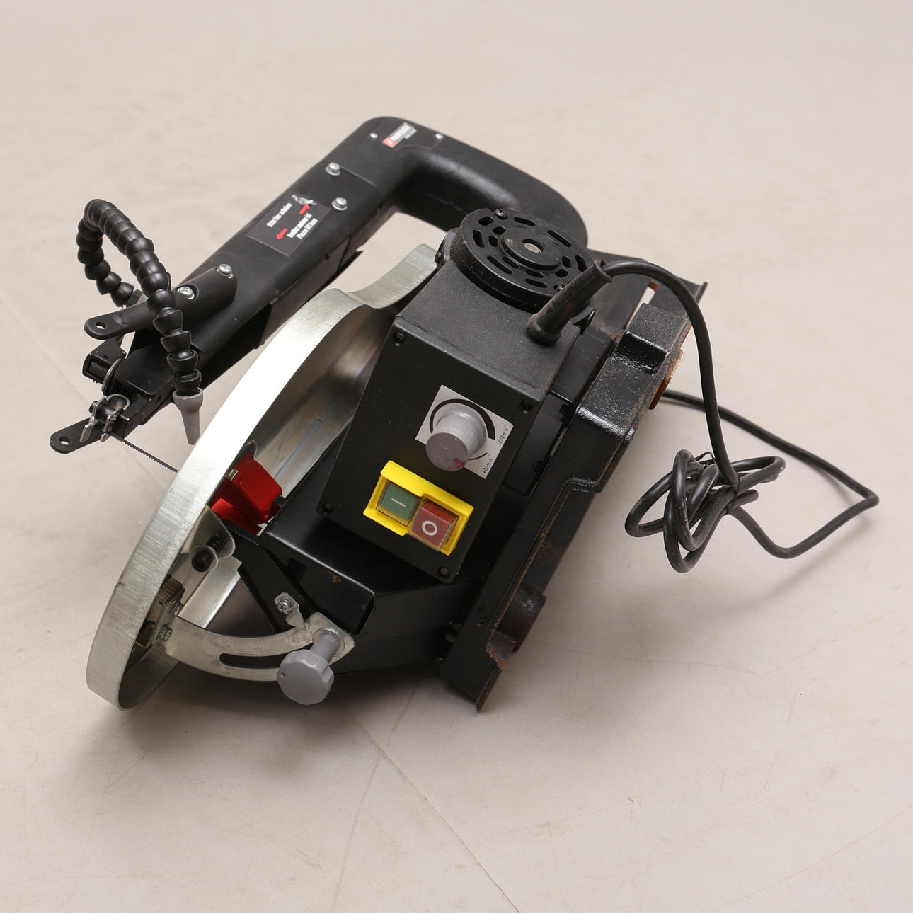Bandsäge auf Bodenständer. Höhe Säge ca. 75, Länge ca. 115 cm. Laubsäge, Parkside, Größe ca. 60x30 cm.