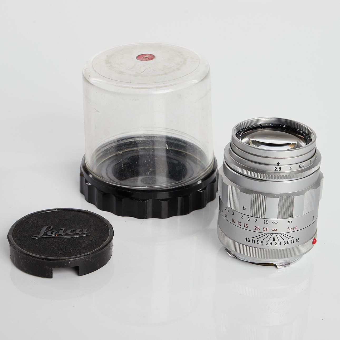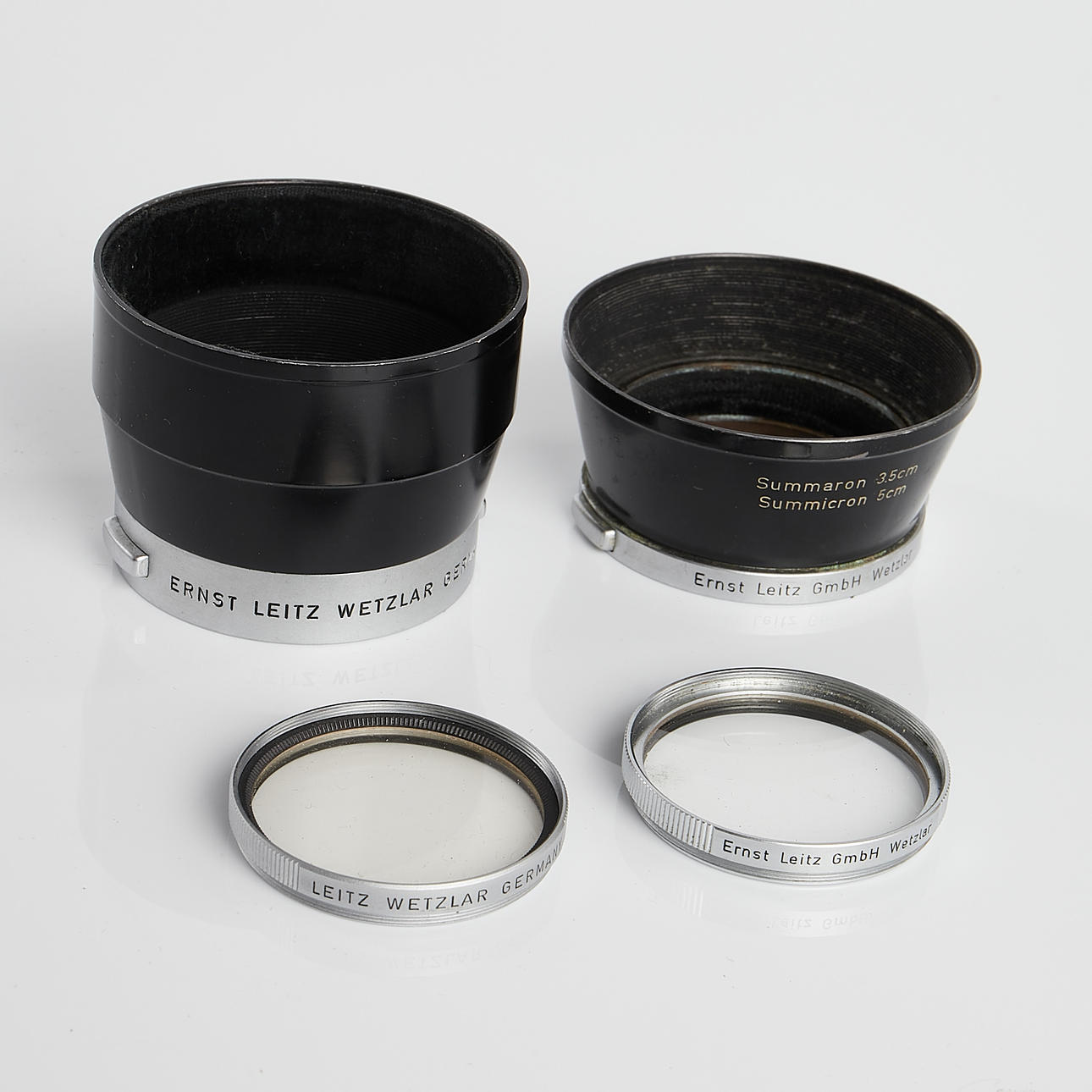 Summicron f=5cm 1:2 Seriennummer: 1326130 inkl. Gegenlichtblende und Leitz UVa-Filter Tele-Elmarit 1:2,8/90 mm Leitz Canada Seriennummer: 2071106 inkl. Streulichtblende und Leitz UVa Filter Gegenlichtblende, Leitz UVa-Filter und Objektivdeckel silber.