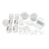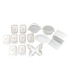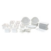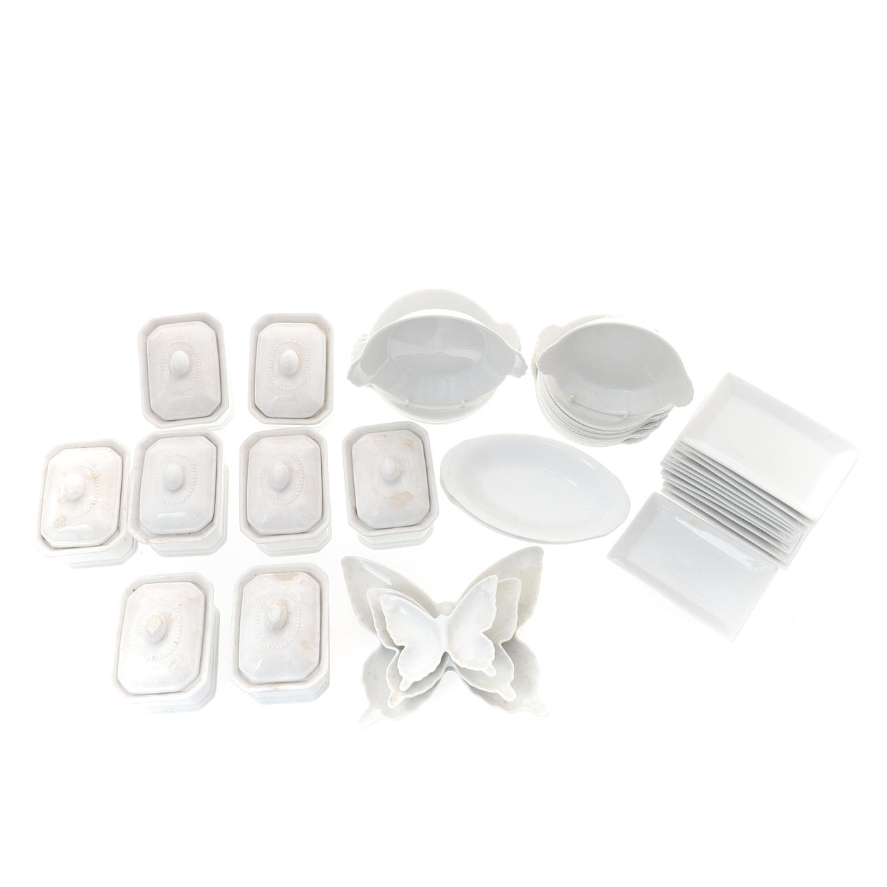 bestehend aus: einem Satz von sechs Beilagen, gestempelt „Porcelaine Tradition, CNP, France“, 18 cm breit, einem Satz von drei ovalen Beilagen, ungemarkt, 19,5 cm breit, einem Satz von zwölf rechteckigen Beilagen, ungemarkt, 14,5 cm breit, ein Satz von elf Beilagen, gestempelt 'Apilco, France', 15,5 cm breit, ein Satz von drei abgestuft stapelbaren Beilagen in Form von Schmetterlingen, ungemarkt, die größte 20,5 cm breit und ein Satz von acht Miniaturterrinen, mit Deckel, 12,5 cm breit (43).