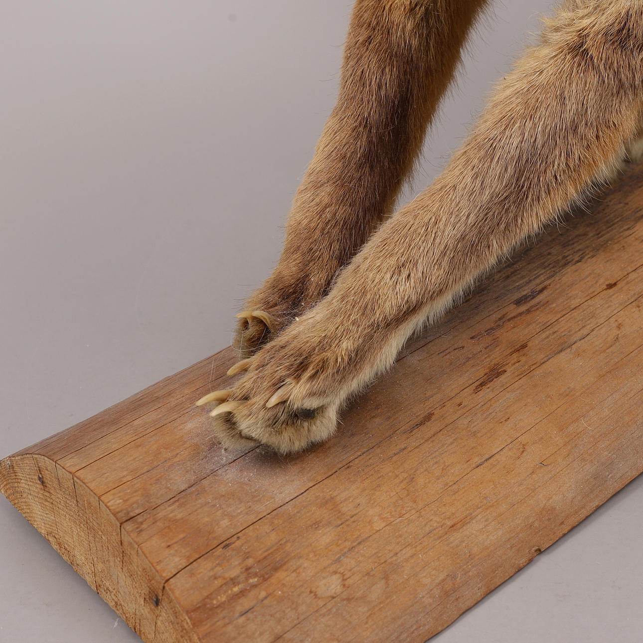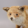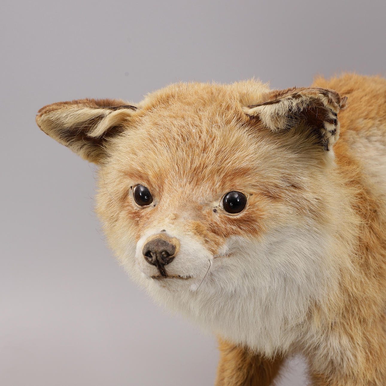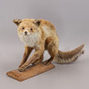 Ausgestopfter Fuchs auf Holzbrett montiert.