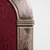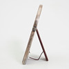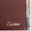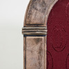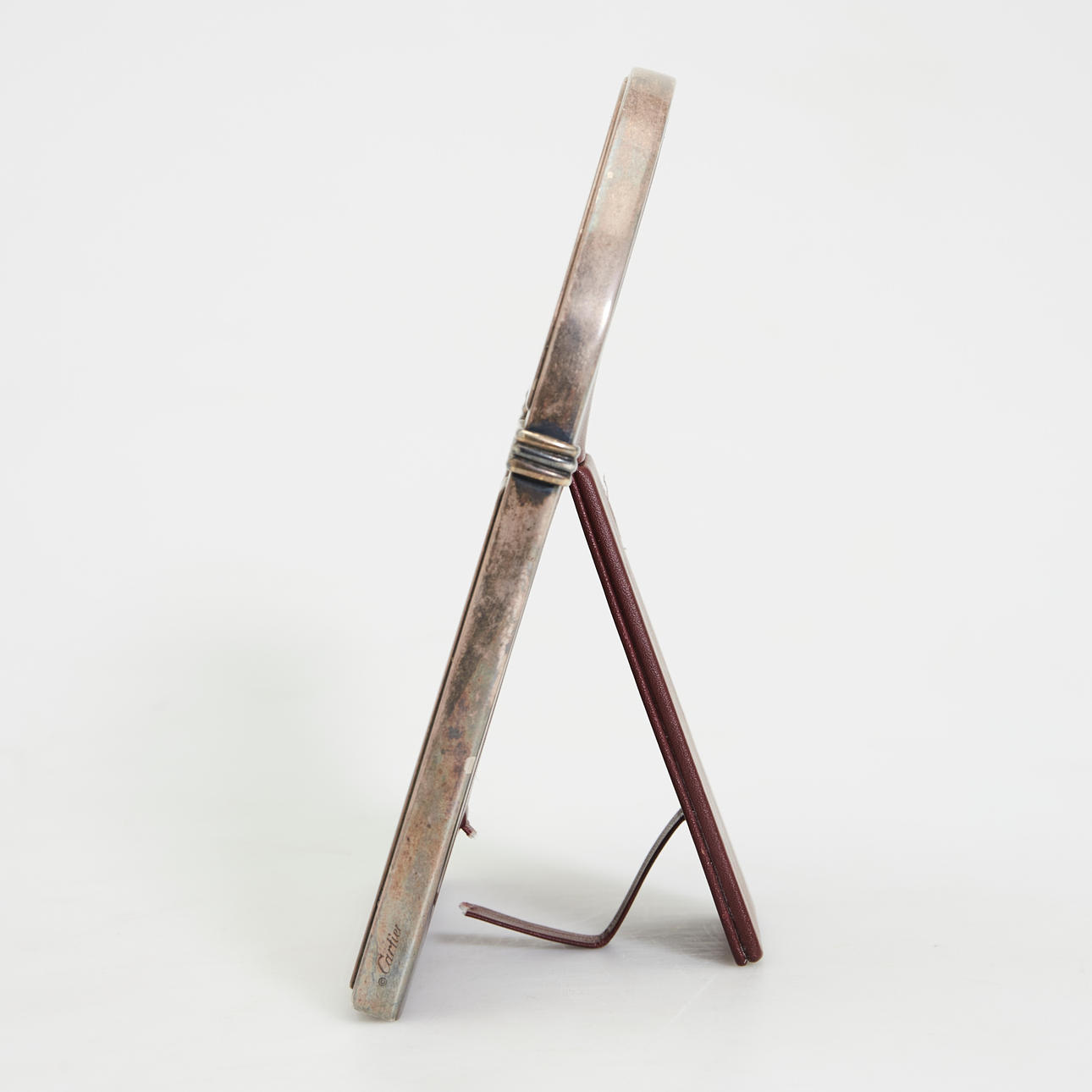 Cartier, Bilderrahmen, Silber, Leder, Glas, Spanien. Bogenförmiger Bilderrahmen aus Silber, hinterfangen von stoffbeschichtetem rötlichem Leder und mit einer Glaseinlage versehen, rückseitig mit einem Standfuß ausgestattet, seitlich und unterseitig gemarkt, H.18cm, B.13,5cm, T.8cm.