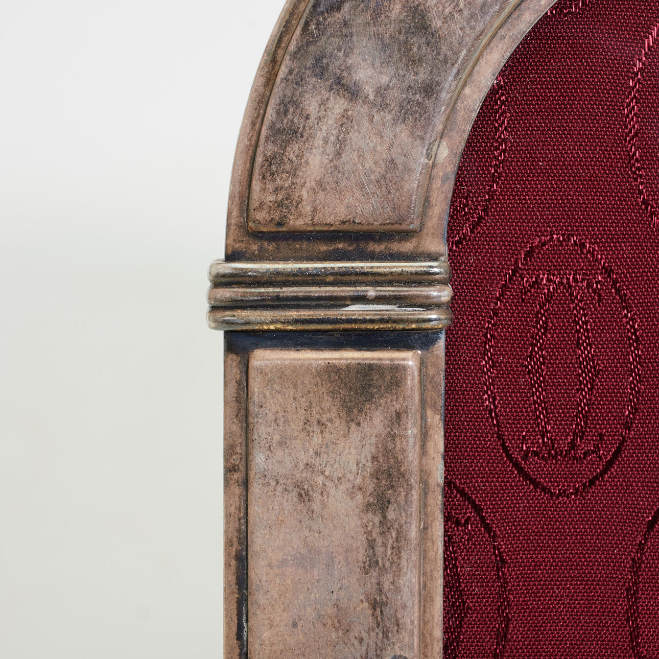 Altersgemäße Gebrauchs- und Reibespuren. Standfuß lose, partiell berieben und Stoff randständig mit Verfärbungen, Patinierung.