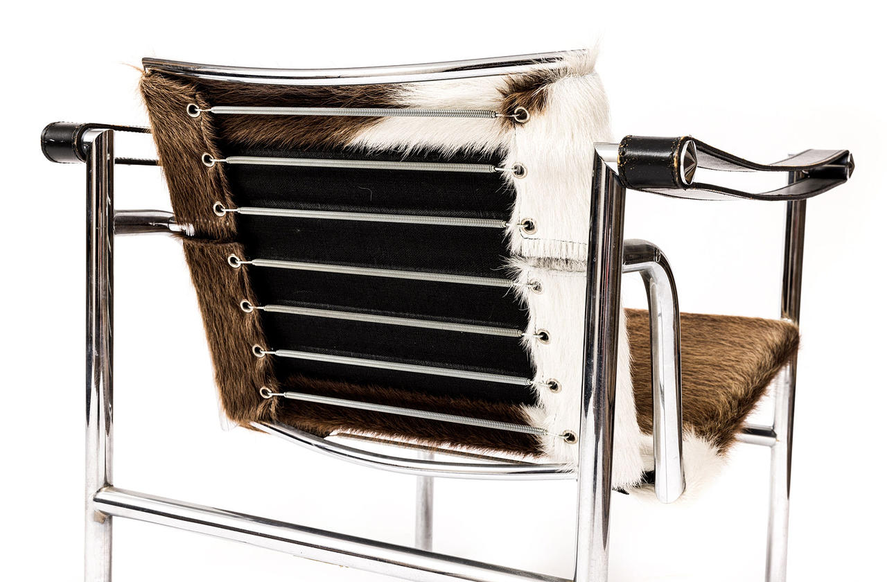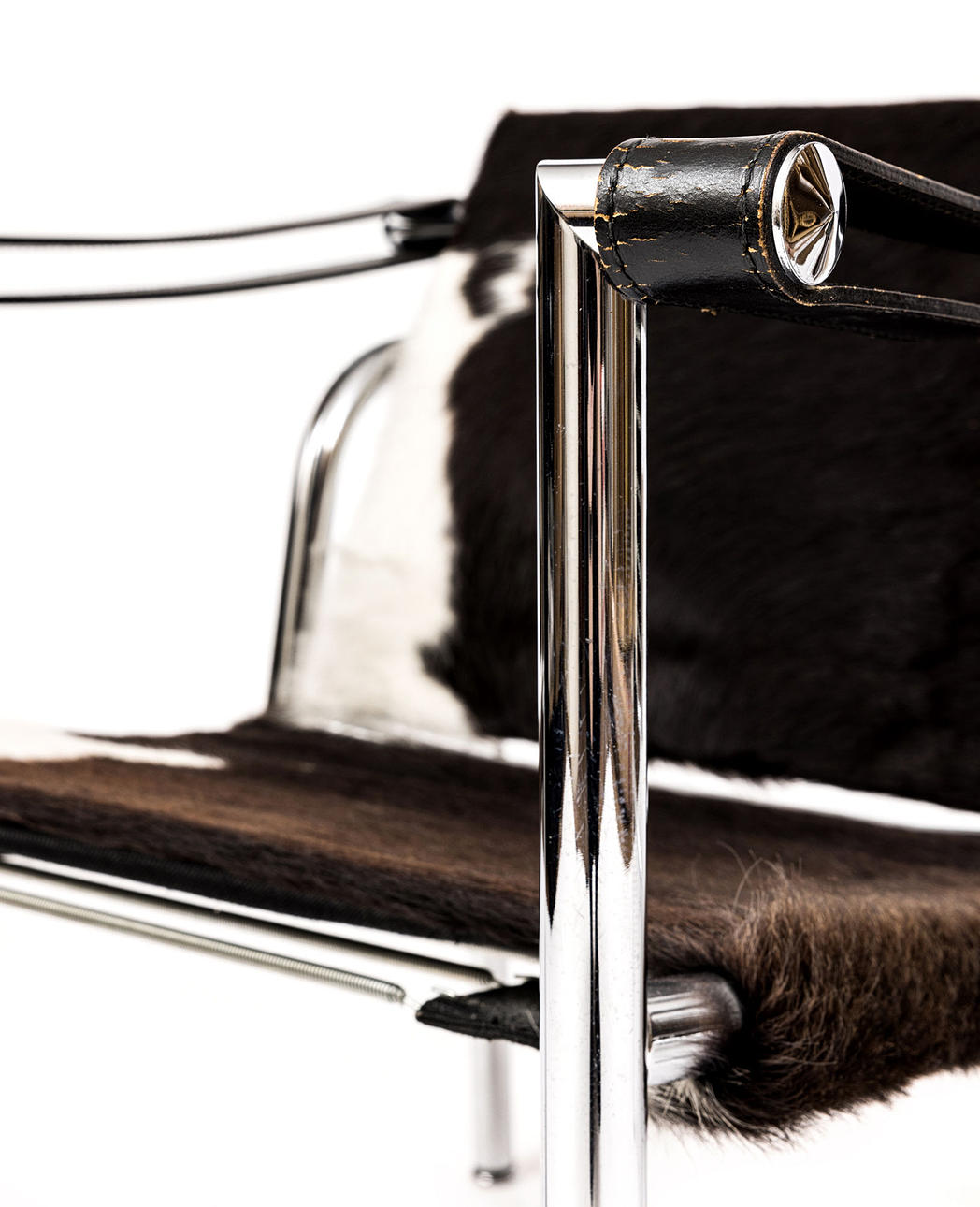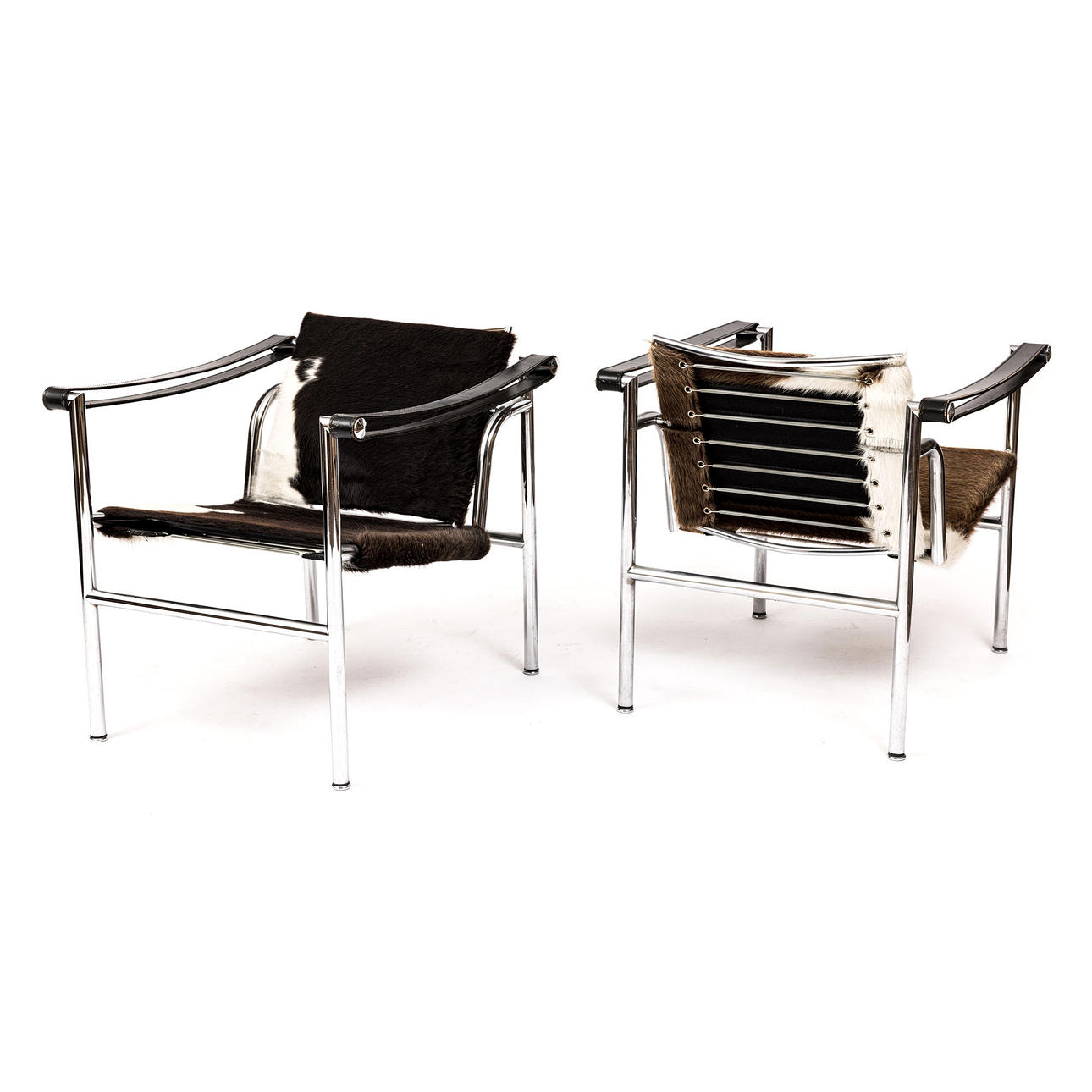 Polierte Chromrahmen. Sitze aus Rindsleder. Lederarmband. Bezeichnet mit „LC/1 17023“ und LC 1 18179“. Sitzhöhe 38/30.