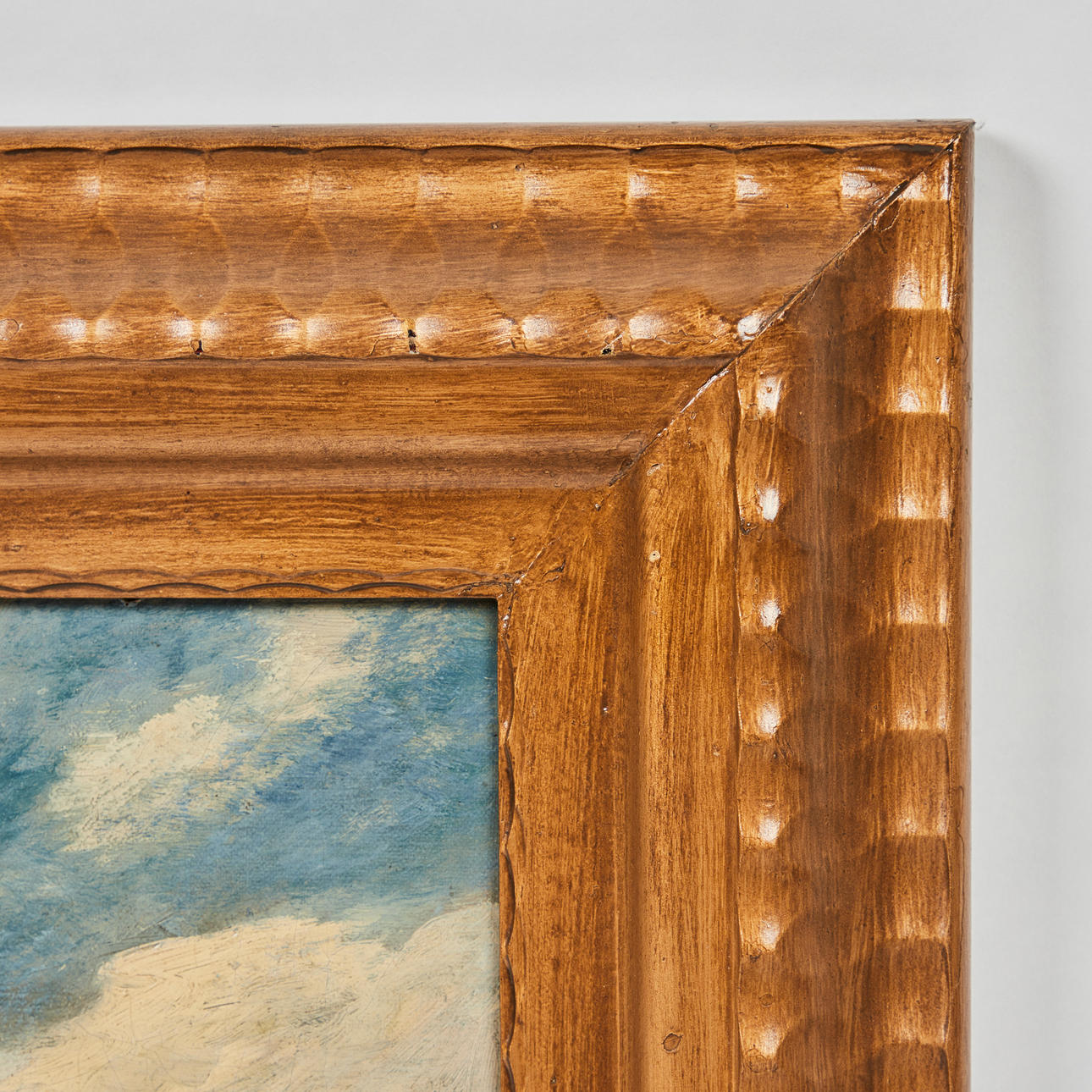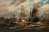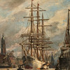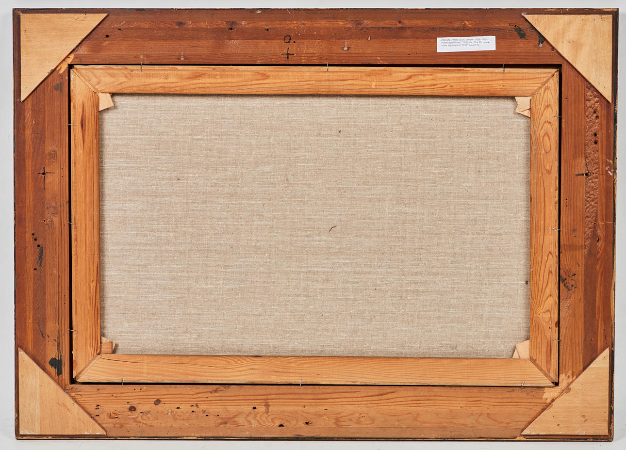 Alfred Jensen (1859-1935), Gemälde, Hamburger Hafen, Öl auf Malplatte, 1916. Darstellung eines wogenden Gewässers mit mehreren Schiffen an einer Küste, unten rechts signiert, datiert und topografiert, sowie auf Klebeetikett bezeichnet, 54x84cm (76x106,5cm).