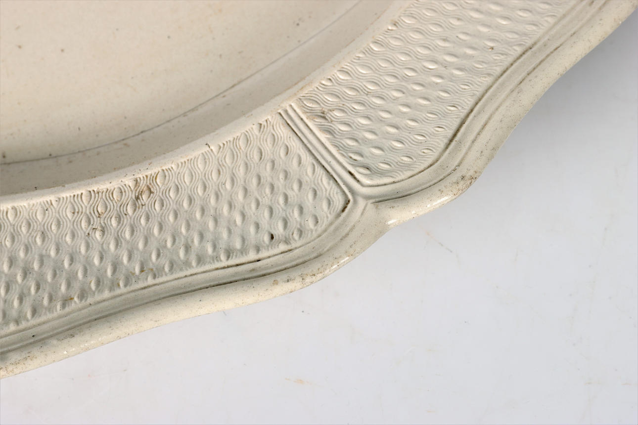Große Servierplatte, glasierte Fayence, 2. Hälfte 19. Jahrhundert. Rand mit Gänsehautdekor. Eierschalenweiße Glasur. Unmarkiert.