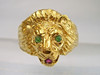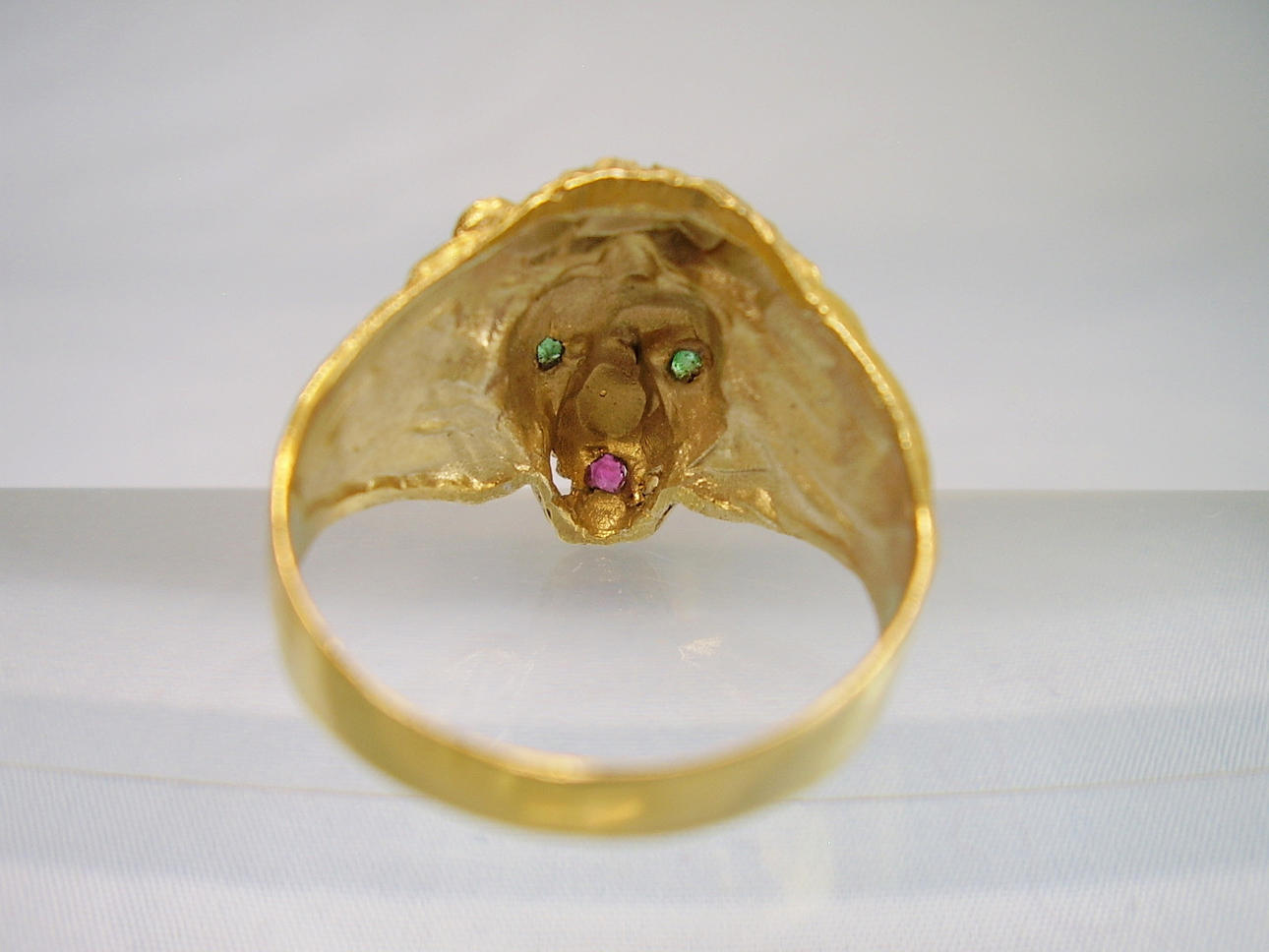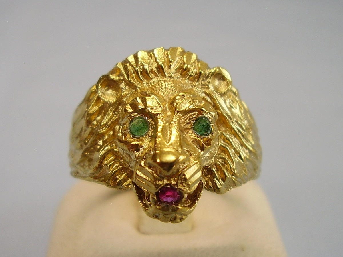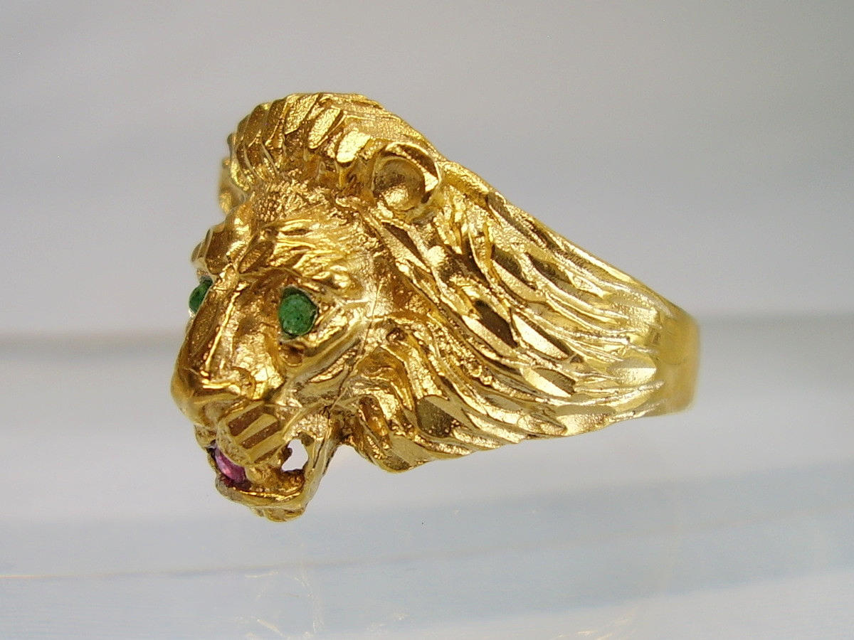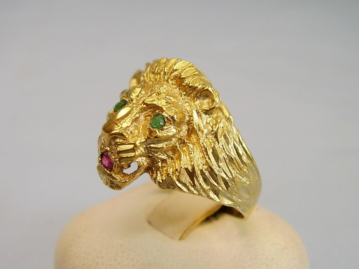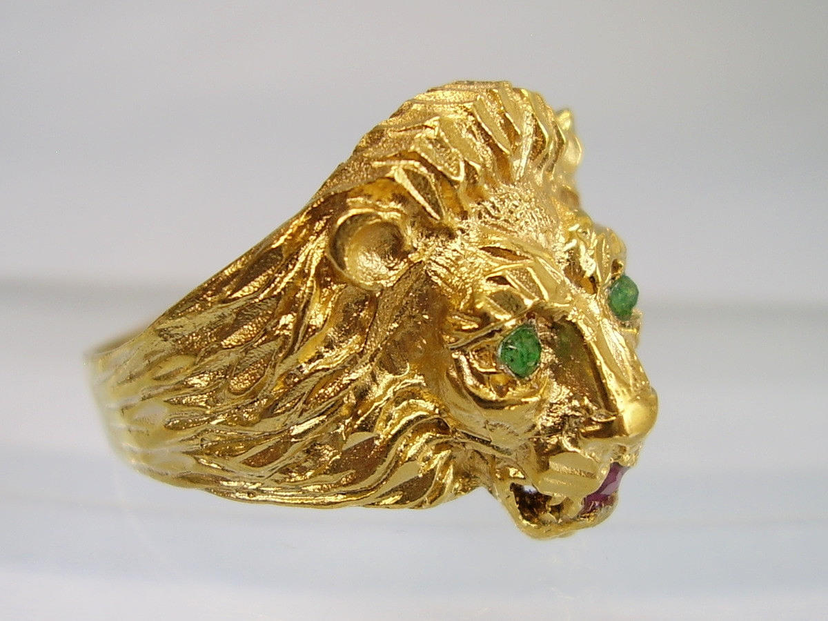 Er ist in Form eines Löwenkopfes ausgearbeitet. Als Augen sind rund facettierte, Natur- Smaragde sowie im Maul ein rund facettierter Natur- Rubin eingesetzt.