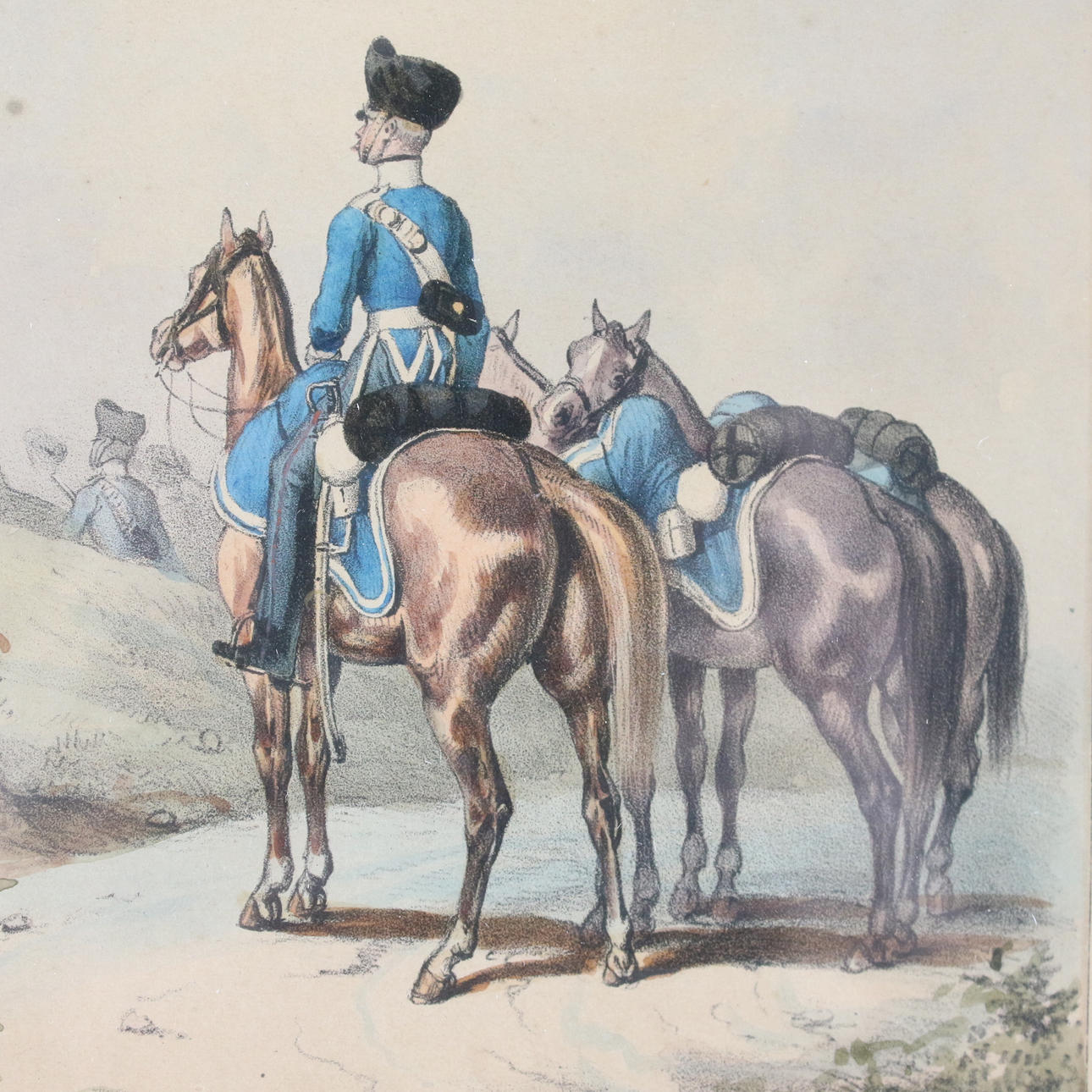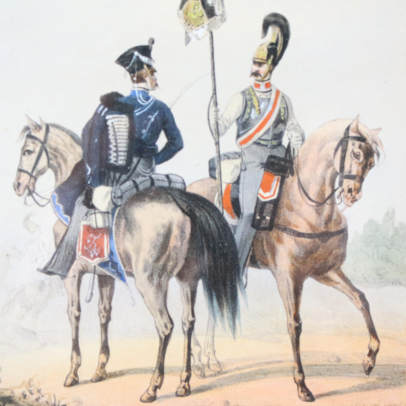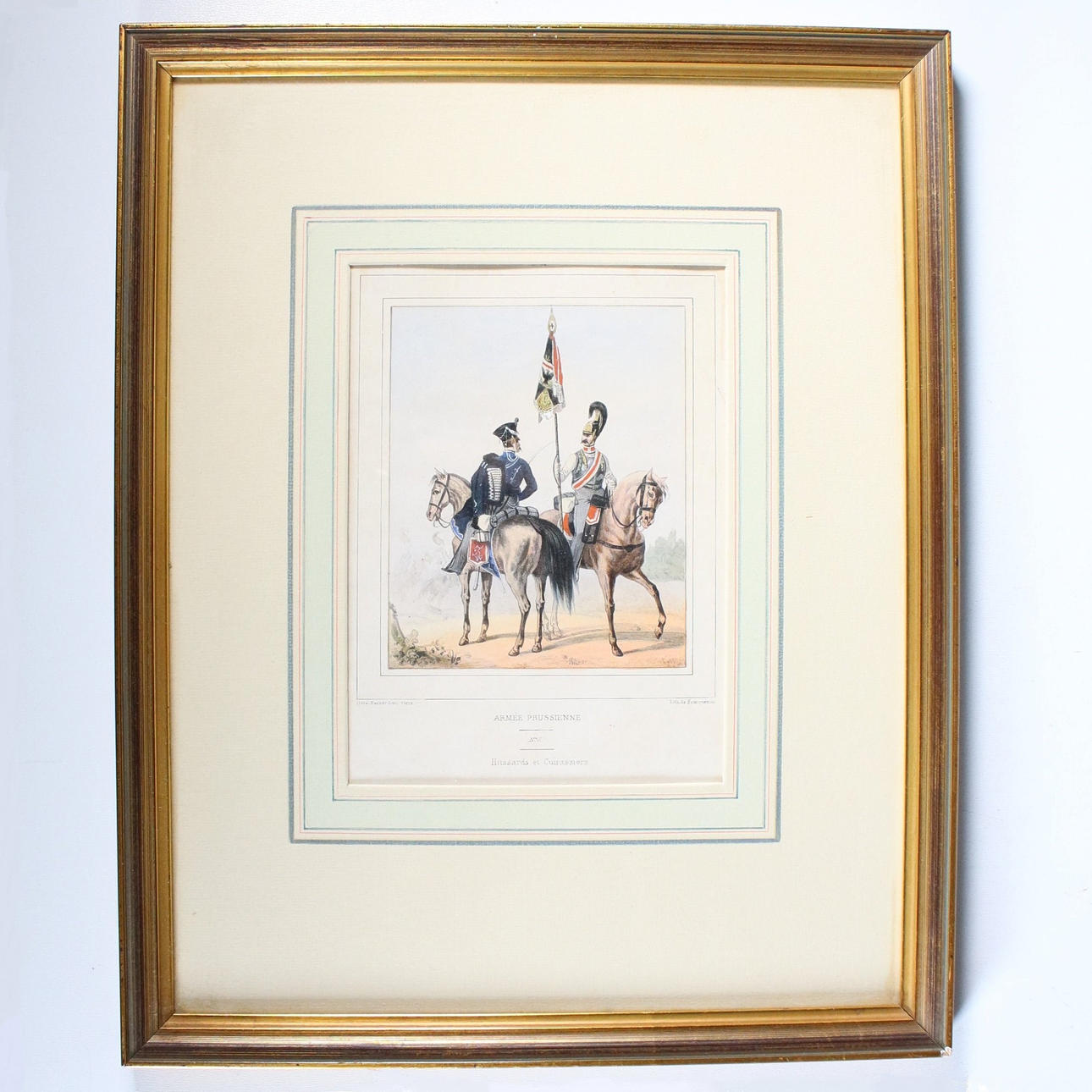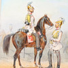 'Preußische Uniformen', 6 kolorierte Lithographien mit Darstellungen preußischer Soldaten zu Pferde (4) und zu Fuß (2) nach Zeichnungen von Dero-Becker u.a. aus 'L'Armee Prussienne', um 1865,