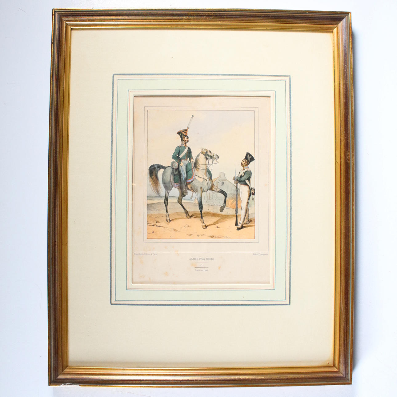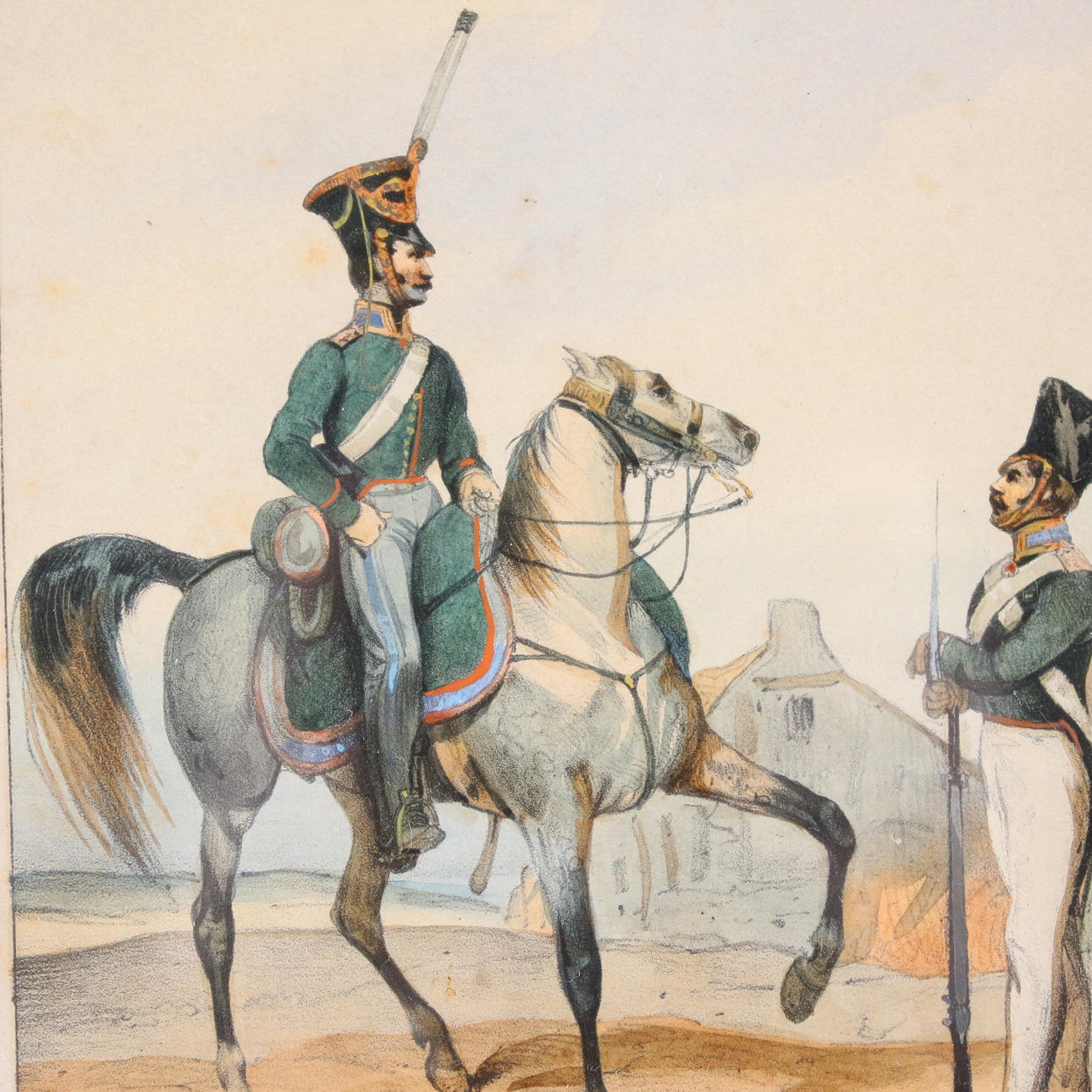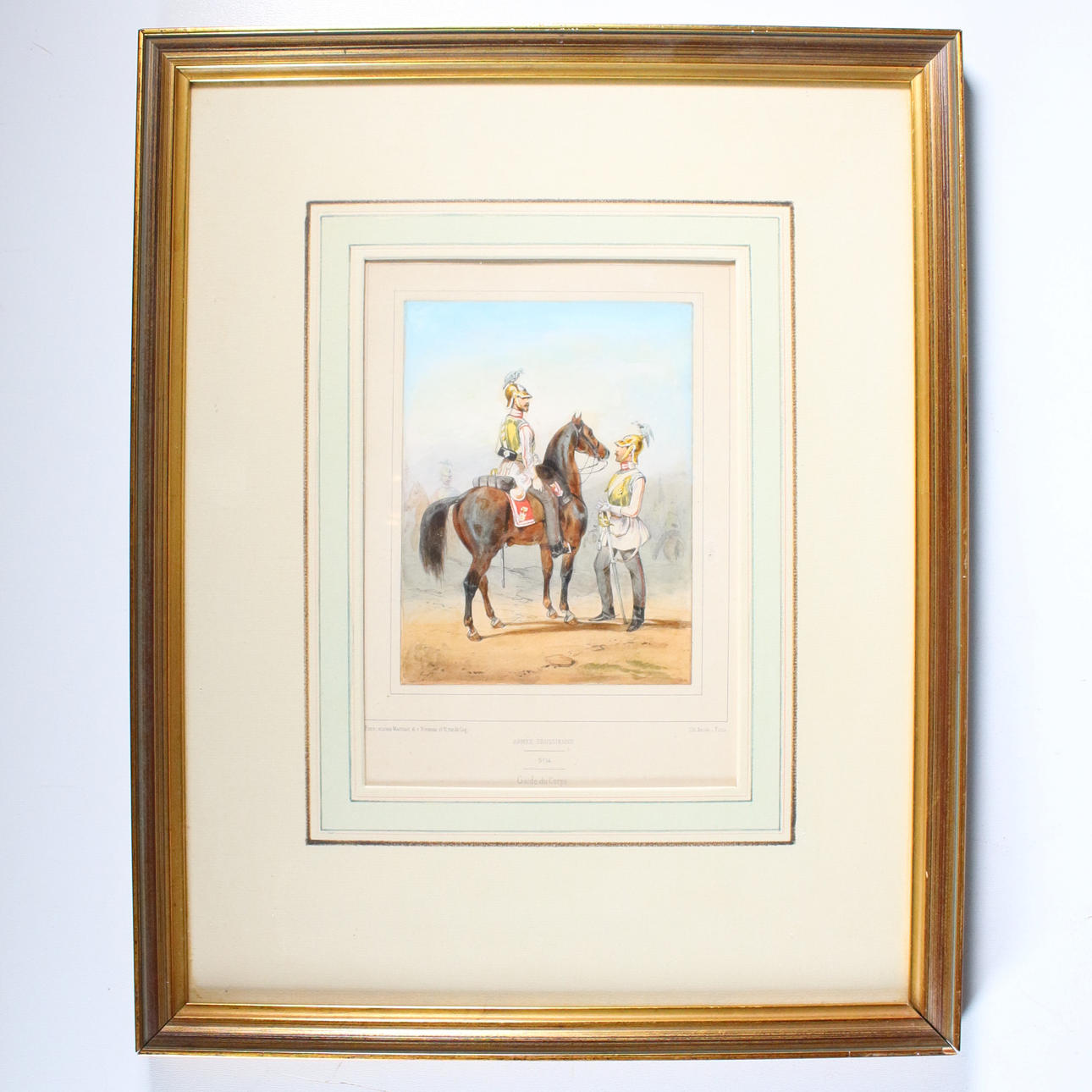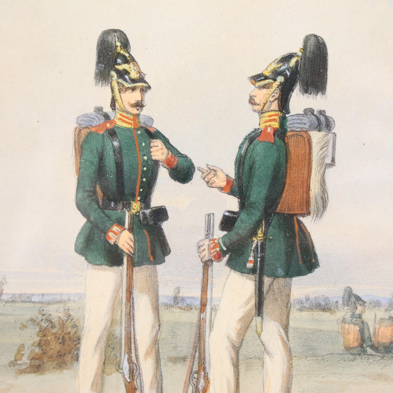 'Preußische Uniformen', 6 kolorierte Lithographien mit Darstellungen preußischer Soldaten zu Pferde (4) und zu Fuß (2) nach Zeichnungen von Dero-Becker u.a. aus 'L'Armee Prussienne', um 1865,