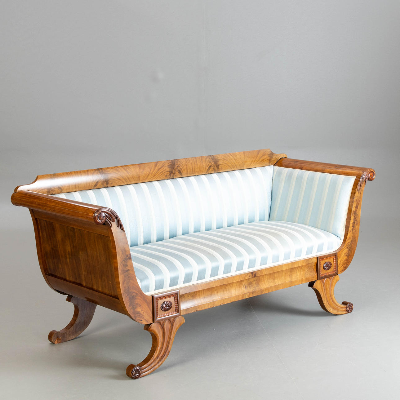 Mahagoni auf Nadelholz furniert. Gekehlte Zarge, seitlich begrenzt von Broschierungen in rechteckigen Reserven, auf gerillten, füllhornartigen Füßen. Geschwungenen Stützen in Akanthusblatt attachierten Voluten auslaufend. Gerade Rückenlehne. HxShxBxT: 84,5 x 47 x 183 x 67 cm.