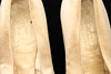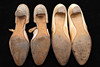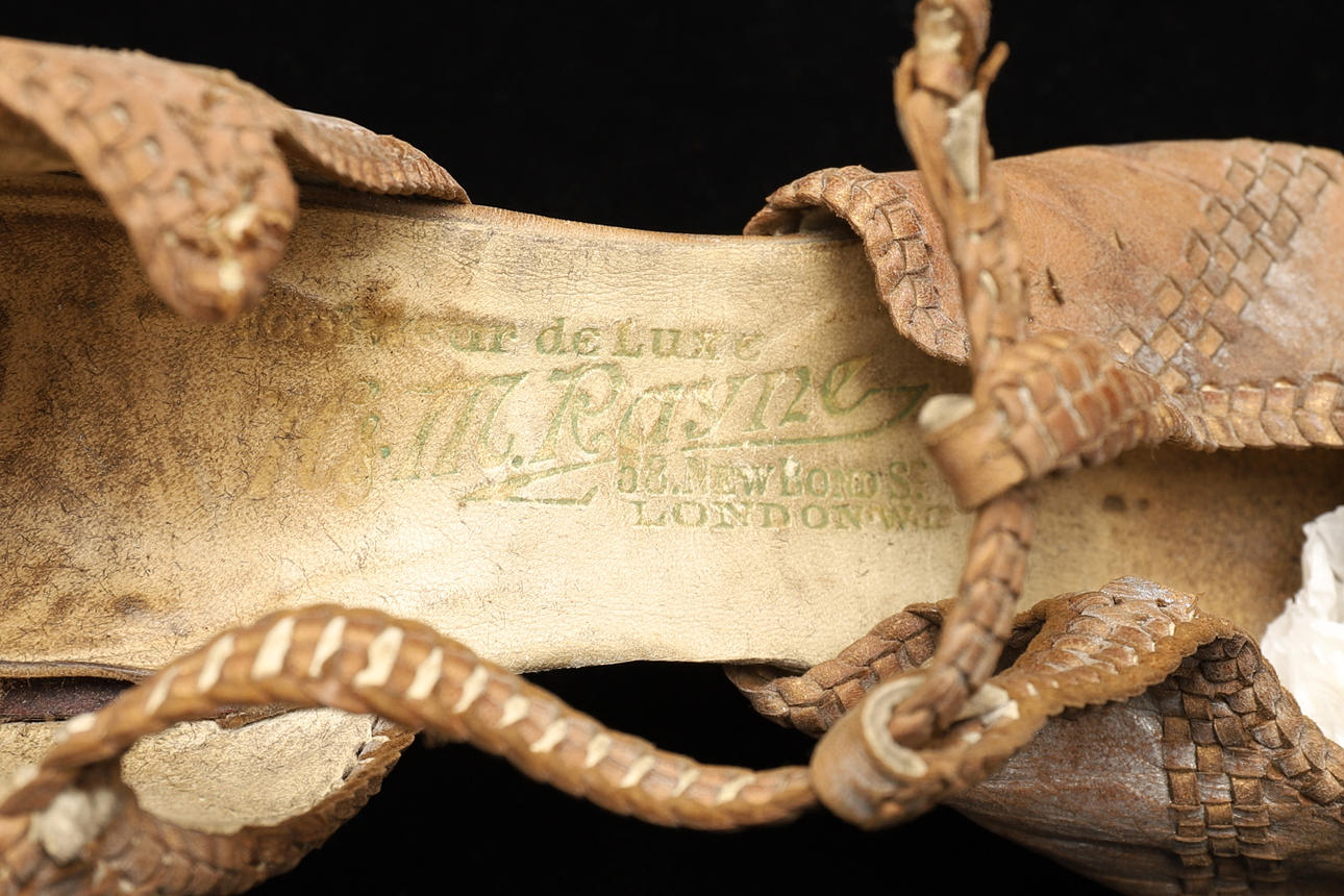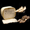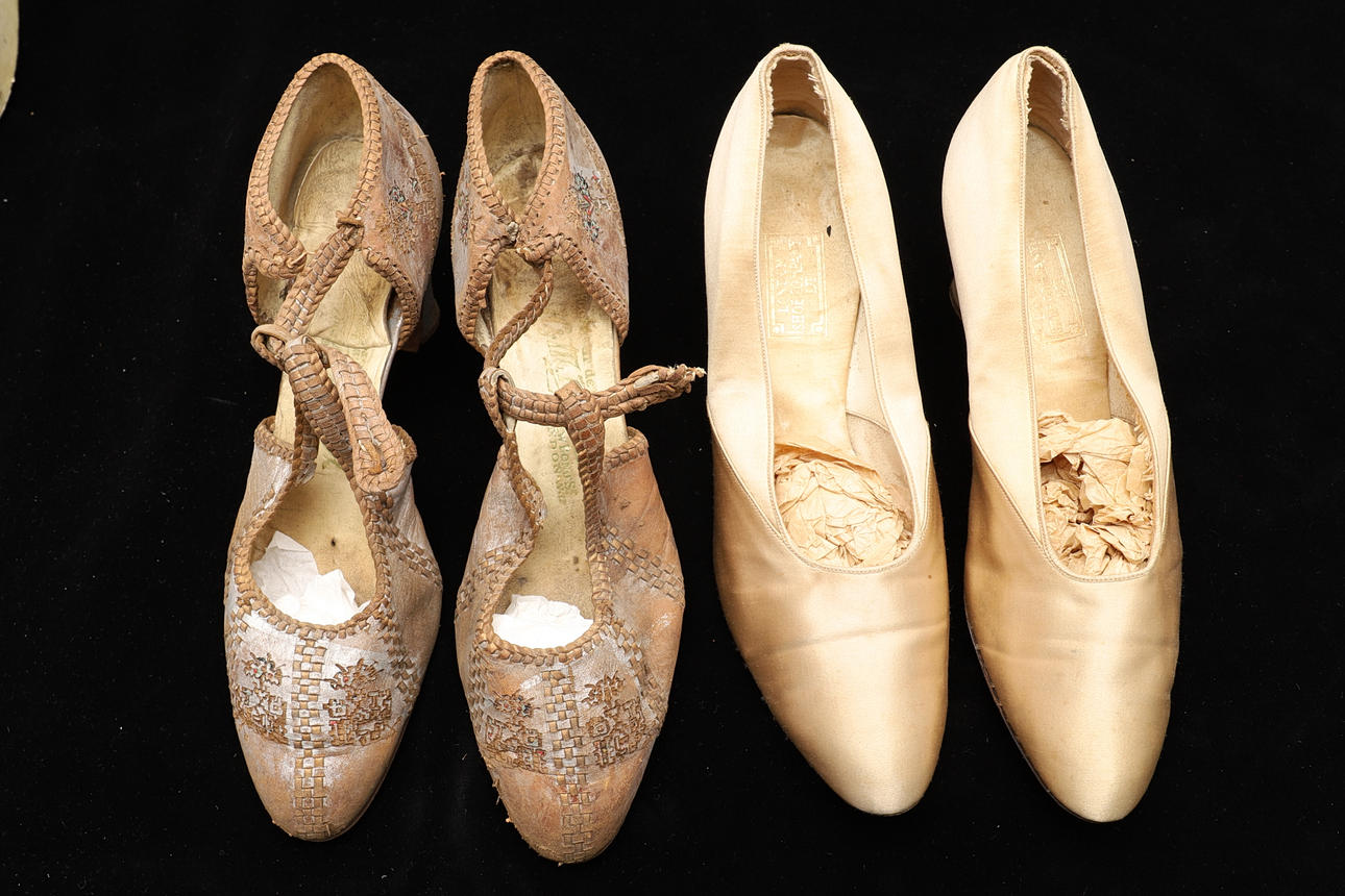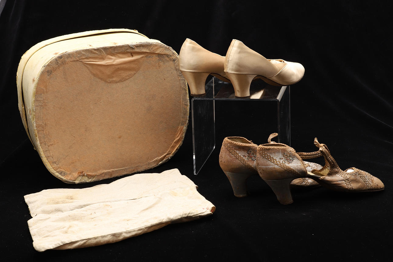 Die Seidenpumps mit alters- und gebrauchsbedingten Flecken und Gebrauchsspuren, die Sandalen mit starken Gebrauchsspuren und Verlust der meisten Farben, verformt. Die Schachtel mit starken Gebrauchsspuren, Stockflecken, Rissen und Flecken.